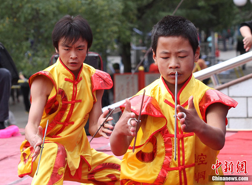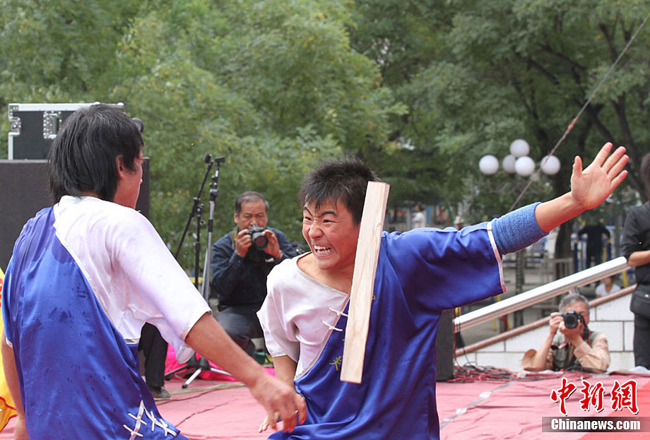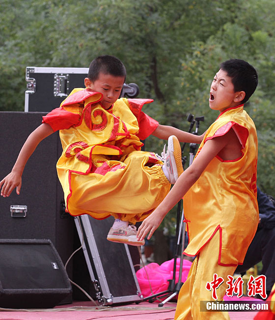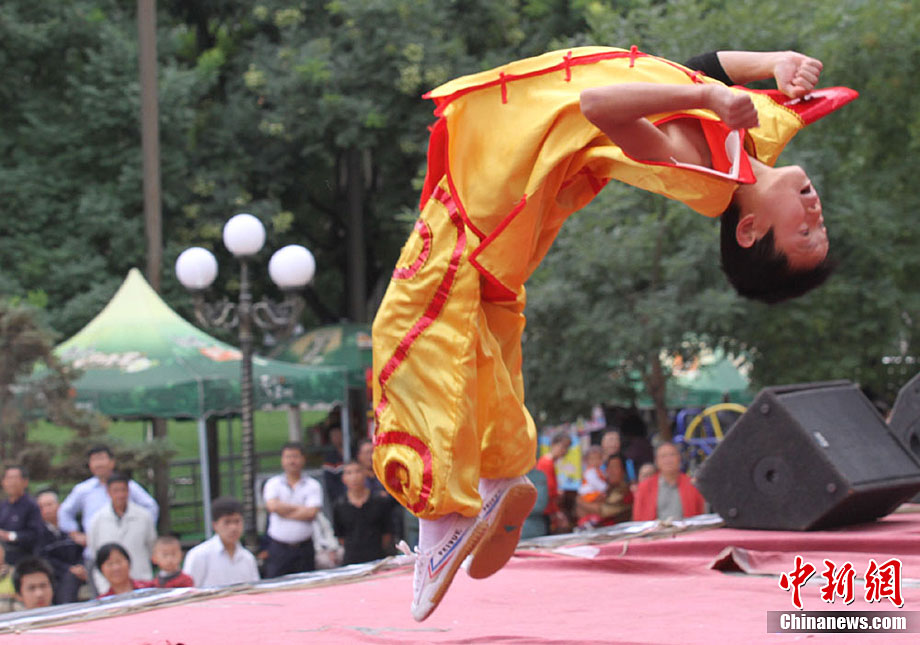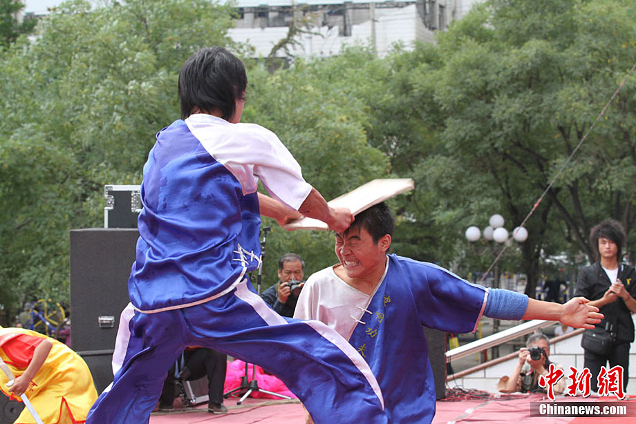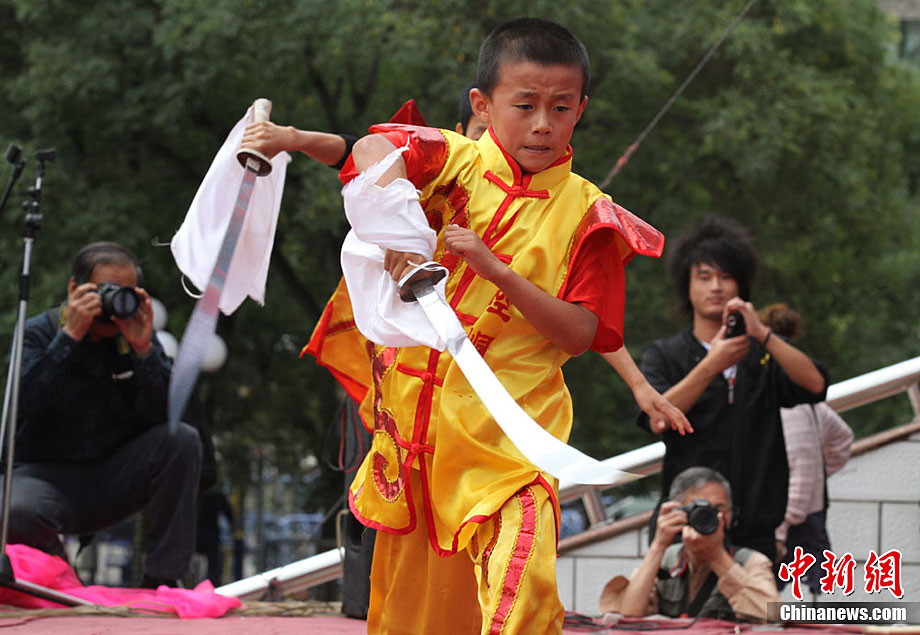 9月1日,蘭州東方紅廣場上演一場崆峒武術秀。崆峒派武術是與少林、武當、峨嵋、昆侖齊名的五大武術流源之一,崆峒武術與道教文化緊密相連,神秘奇詭,風格獨特。中新社記者 殷春永 攝