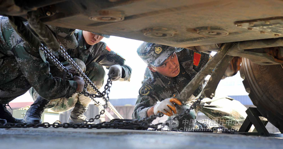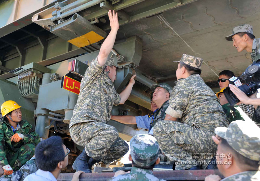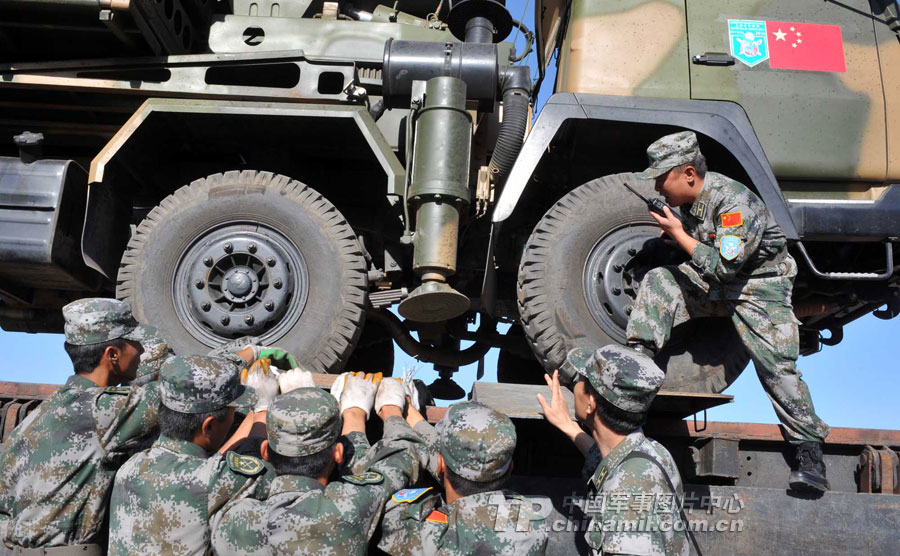 顧不上長(zhǎng)途奔波和路途勞累的參演官兵,到達(dá)換裝點(diǎn)后就立即開始了換乘換裝。經(jīng)過(guò)近6小時(shí)的卸載、裝載,中方參演部隊(duì)的裝備車輛全部駛上了哈方軍列,并在鐵路專業(yè)裝卸隊(duì)的協(xié)助下,對(duì)20噸以上輪式裝備按照哈方的要求進(jìn)行捆綁加固。