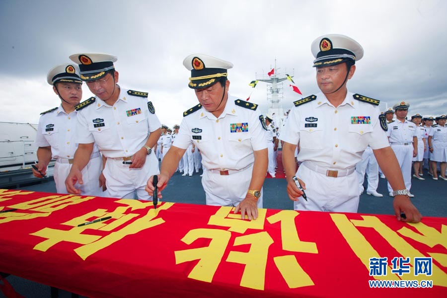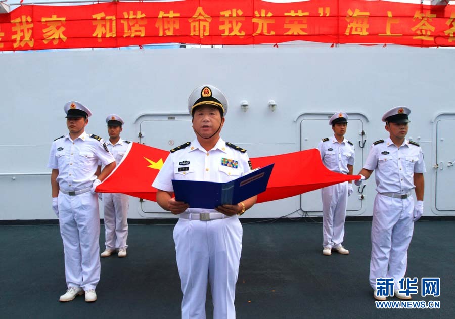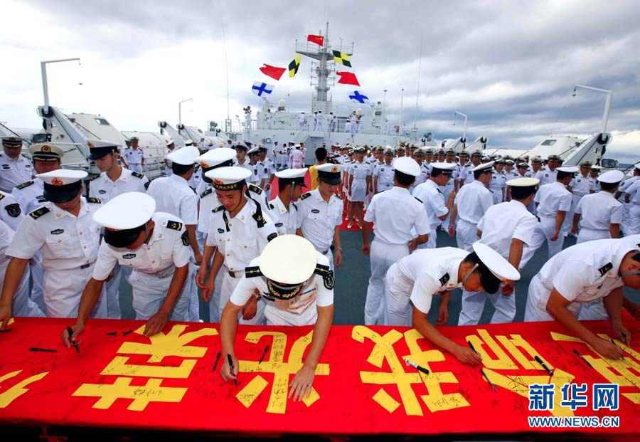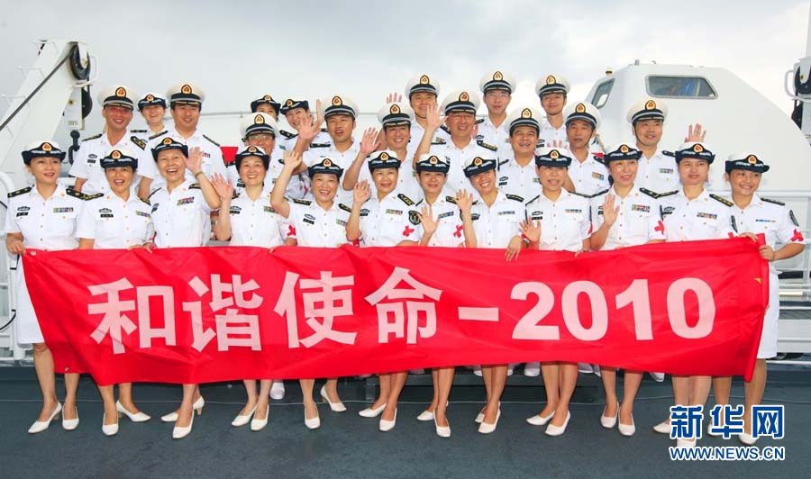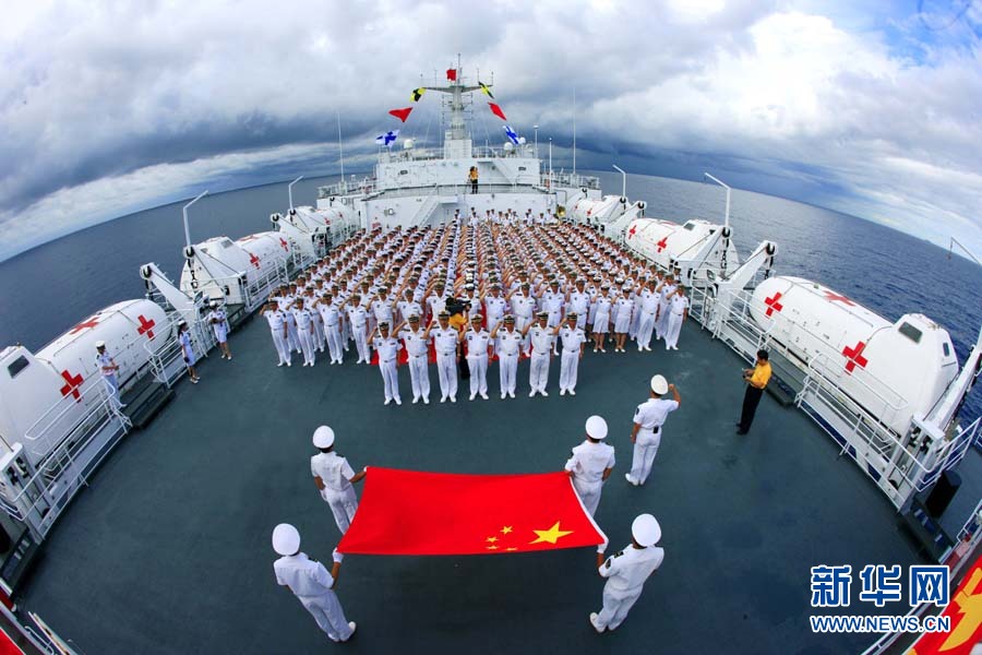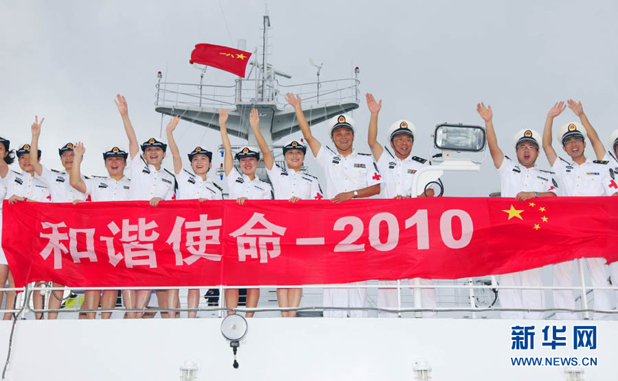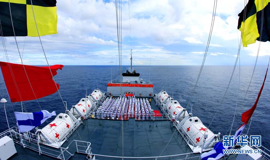 9月6日,“和平方舟”號醫(yī)院船舉行宣誓儀式。當日,經過連續(xù)多天的航行,前往亞丁灣海域及吉布提等亞非五國執(zhí)行“和諧使命—2010”任務的中國“和平方舟”號醫(yī)院船駛出國門。這是“和平方舟”號醫(yī)院船首次穿越南海駛向大洋。428名官兵及醫(yī)務人員全程參加這次為期87天的任務,總航程將達1.5萬多海里。自8月31日駛離舟山碼頭后,醫(yī)院船經受了“獅子山”“圓規(guī)”“南川”臺風的考驗,穿越臺灣海峽、西沙群島和南沙群島,順利抵達南海。查春明 攝 圖片來源:新華網