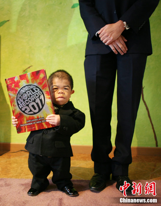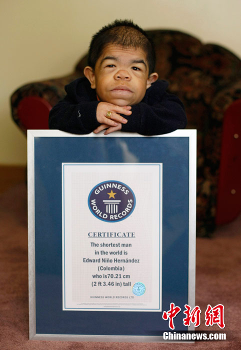 身高僅70厘米的哥倫比亞男子愛德華·尼科·埃爾南迪斯近期獲得吉尼斯世界紀錄世界最矮男人的稱號。身高為74厘米的前吉尼斯世界紀錄保持者何平平3月13日去世后,吉尼斯紀錄認證官員找到了身高70厘米的埃爾南迪斯,F(xiàn)年24歲的他體重只有10公斤,出生時體重為1.5公斤,體長38厘米。然而,埃爾南迪斯的這個頭銜不會保持太久,尼泊爾少年馬加爾今年10月14日年滿18周歲后,有望取代他成為世界最矮的男人,馬加爾身高僅56厘米。