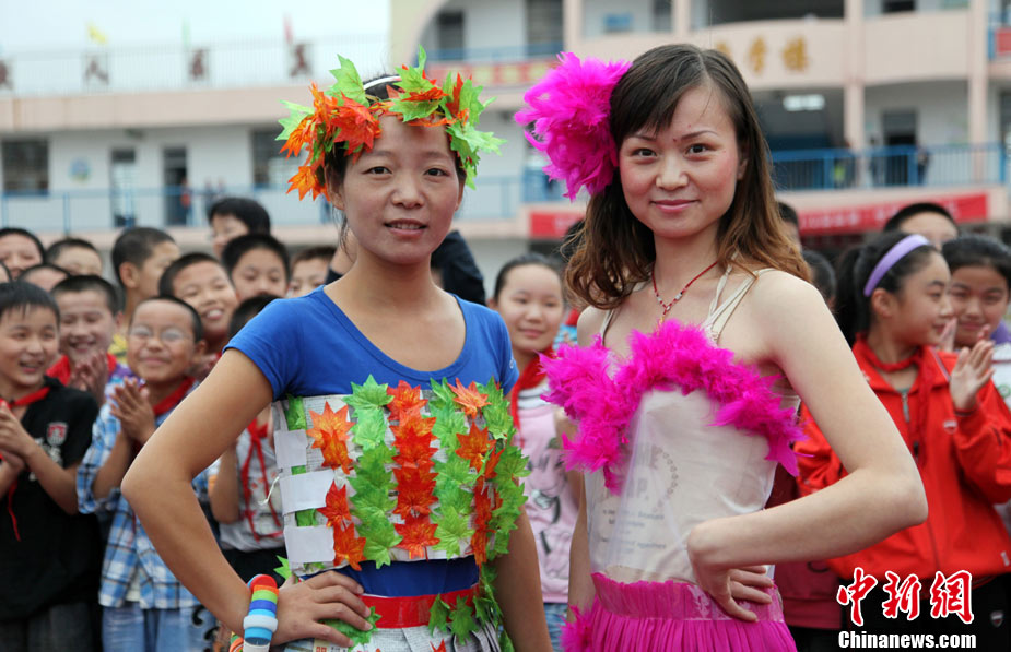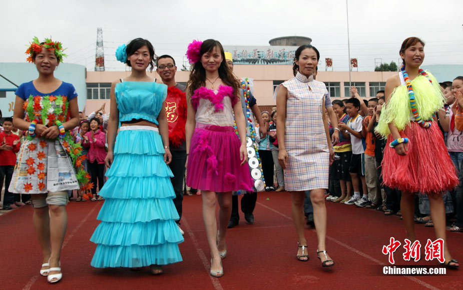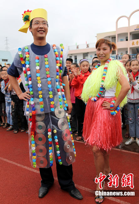 9月8日,山東省棗莊市市中區(qū)中興小學(xué)教師用舊報(bào)紙、光盤等廢舊物品制作的環(huán)!皶r(shí)裝”,向?qū)W生們進(jìn)行展示。他們用實(shí)際行動(dòng)引導(dǎo)學(xué)生養(yǎng)成低碳生活的良好習(xí)慣,喜迎教師節(jié)到來(lái)。中新社發(fā) 吉 喆 攝 圖片來(lái)源:CNSPHOTO