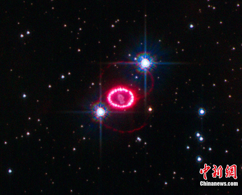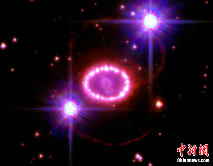 美國宇航局近日拍到一顆名為1987A的超新星爆發(fā)時(shí)形成的美麗“星膽”,而這場絢麗的爆發(fā)距離地球約16.3萬光年。“星膽”中圍繞著超新星爆發(fā)后留下的30到40個(gè)閃亮的殘余物,形成一個(gè)直徑約9.6萬億公里的圓環(huán),酷似由一顆顆璀璨的珍珠串成的項(xiàng)鏈。