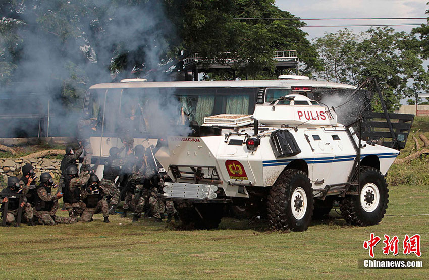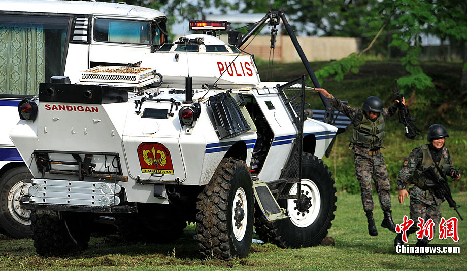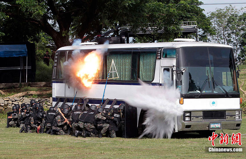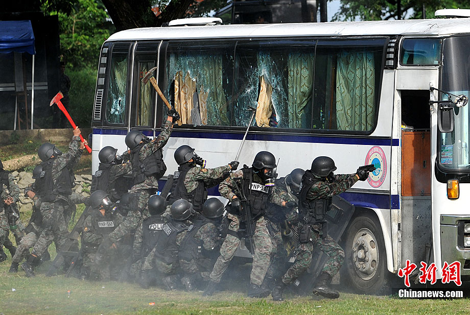 當?shù)貢r間9月9日,菲律賓警察特別行動部隊成員在菲律賓首都馬尼拉附近的營地舉行了人質救援演習。菲律賓總統(tǒng)阿基諾三世親自前往觀看該救援演習。