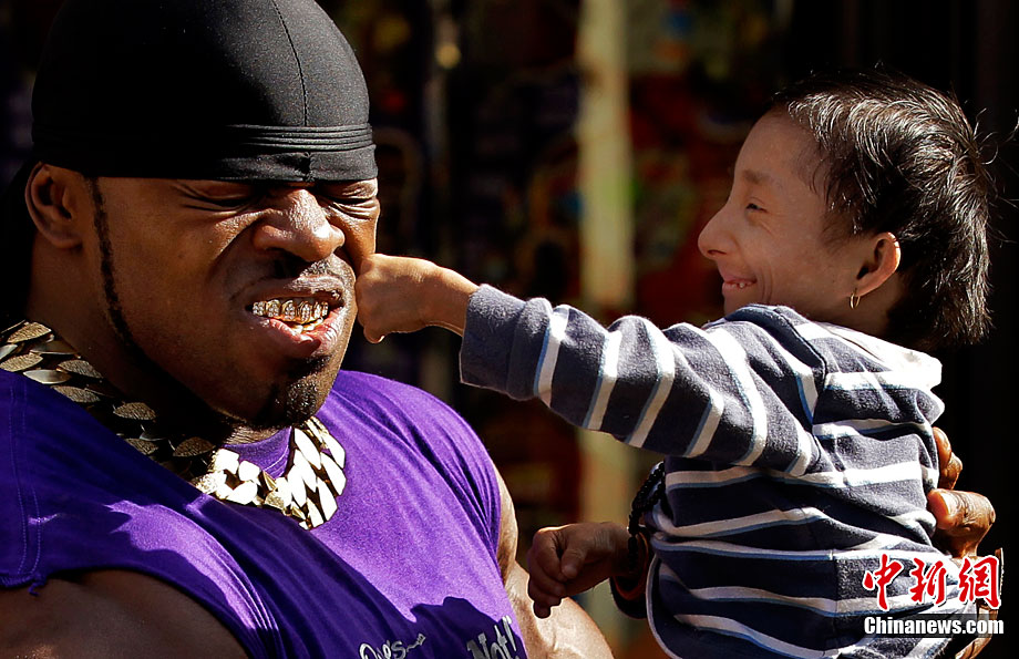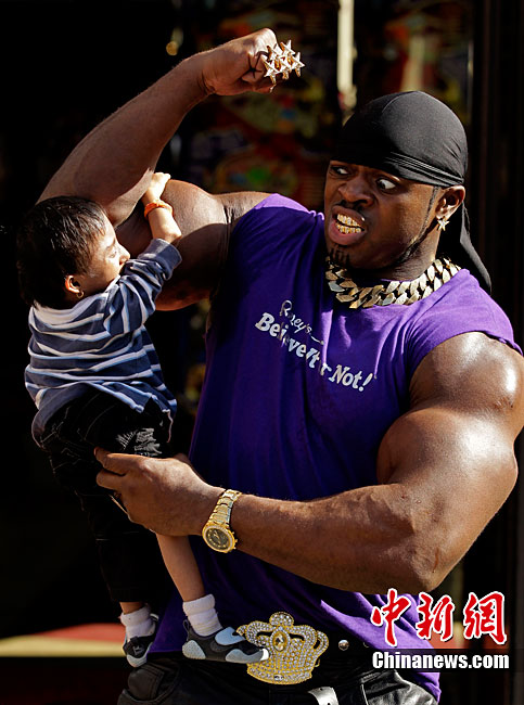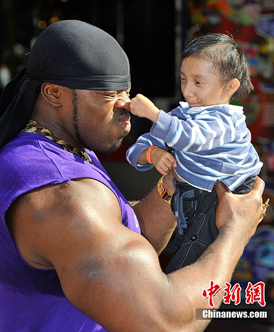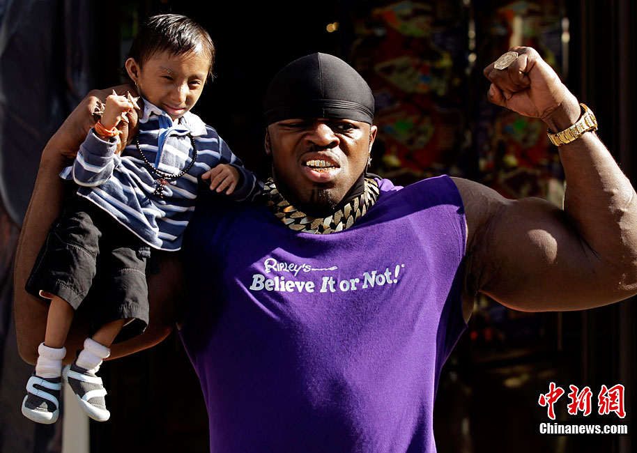 9月9日,全世界最矮男子——來自尼泊爾的馬嘉爾和英國胳膊最粗的男子安德魯.哈里森在倫敦參加“信不信由你”博物館的慶;顒(dòng)。馬嘉爾17歲,是身高為56厘米;而28歲的哈里森的胳膊圍度達(dá)61厘米。但是塊頭大并不能給哈里森帶來多大便宜,相反小巧的馬嘉爾卻是靈活異常。