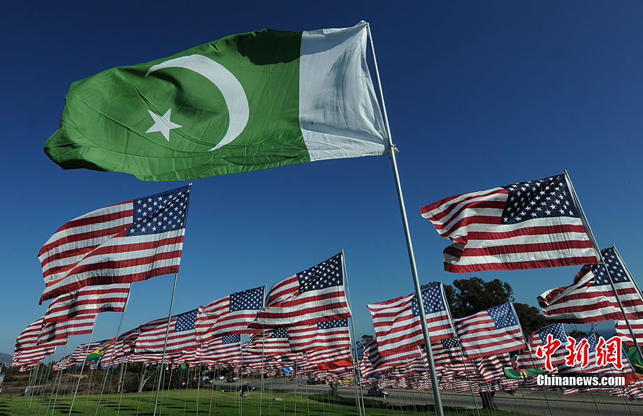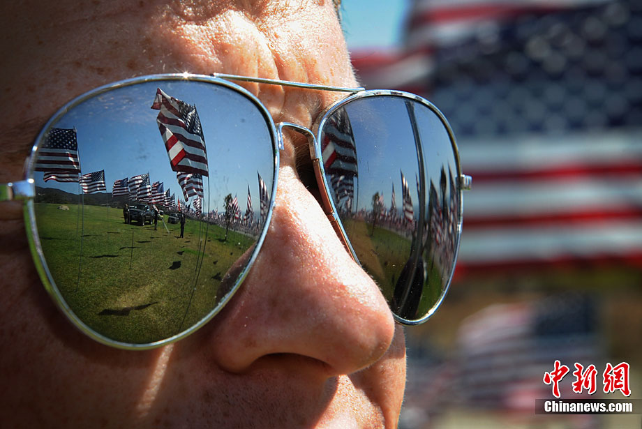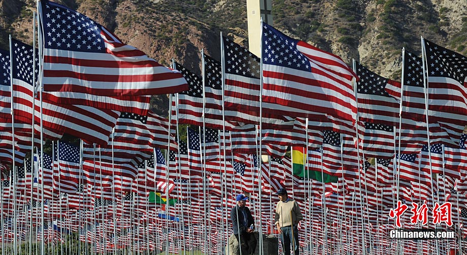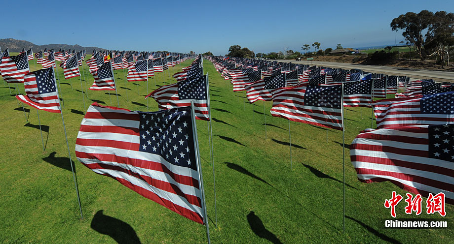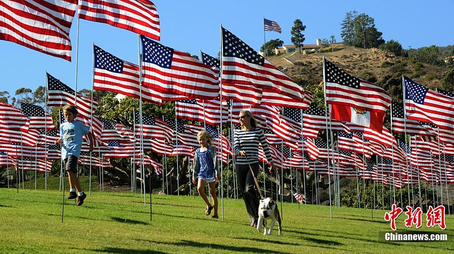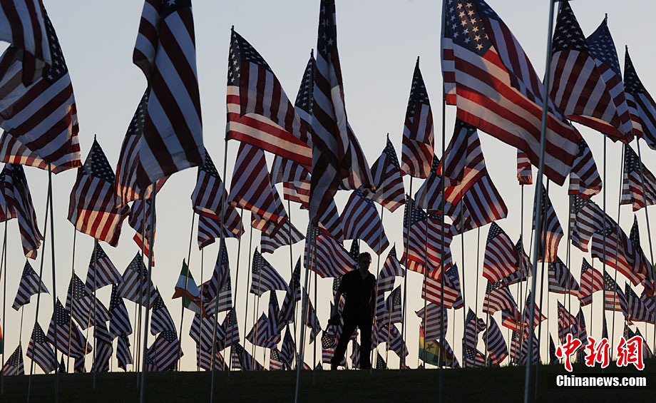 當(dāng)?shù)貢r(shí)間9月10日,在美國(guó)加利福尼亞州的馬里布,一些大學(xué)生在馬里布佩珀代恩大學(xué)的草坪上插上近3000面美國(guó)國(guó)旗和其它國(guó)家和地區(qū)的旗幟,紀(jì)念“9·11”恐怖襲擊事件的遇難者。
