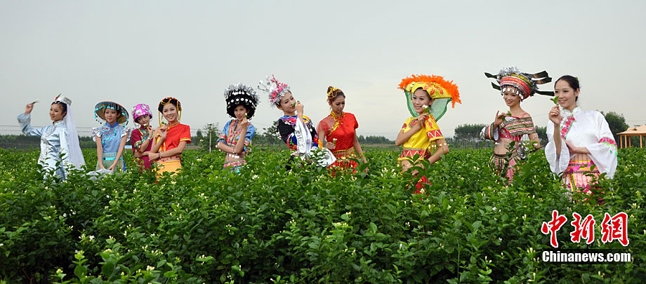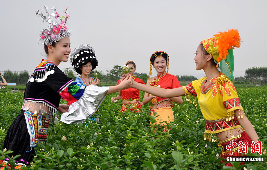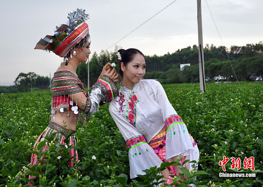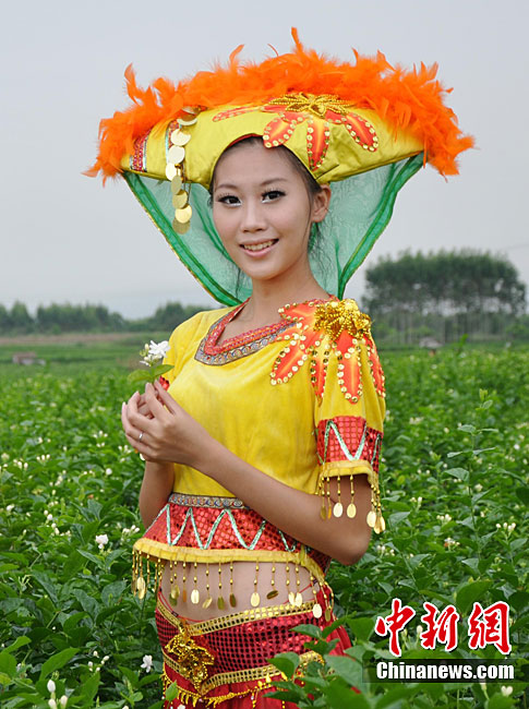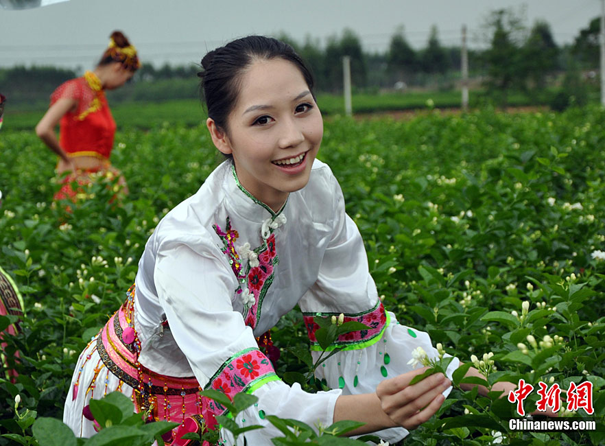 9月11日,“中國茉莉之鄉(xiāng)”廣西南寧橫縣,少數(shù)民族美女在“中華茉莉園”忙采茶。9月10日至12日,由中國花卉協(xié)會(huì)花文化專業(yè)委員會(huì)、中國茶葉流通協(xié)會(huì)茶館專業(yè)委員會(huì)和南寧市人民政府主辦的2010年中國國際茉莉花文化節(jié)在廣西橫縣舉行。橫縣是世界最大的茉莉花生產(chǎn)和花茶加工基地,茉莉花種植面積達(dá)到10萬畝,花農(nóng)33萬人,年產(chǎn)鮮花8萬多噸,茉莉花產(chǎn)量和花茶加工總量均占全國80%以上,占世界的60%。中新社記者 楊志雄 攝