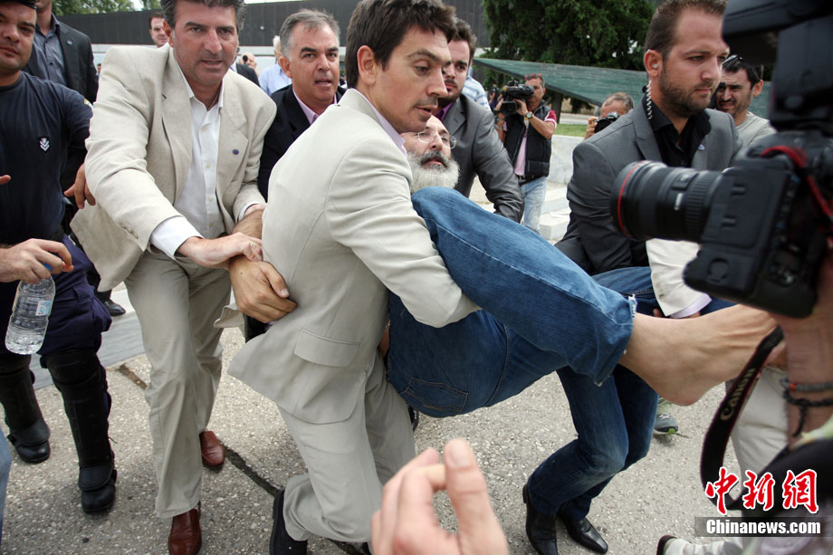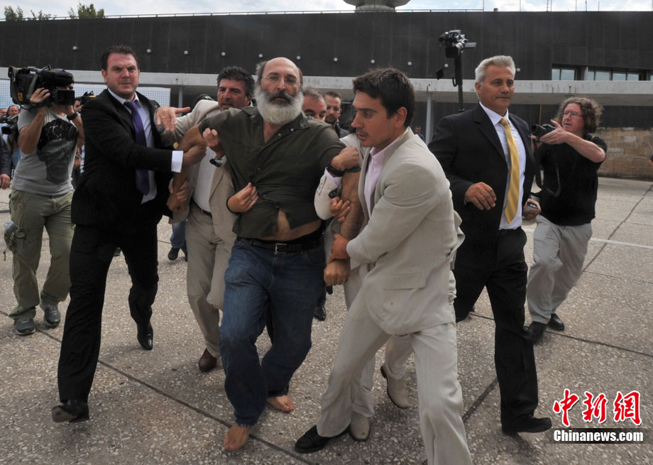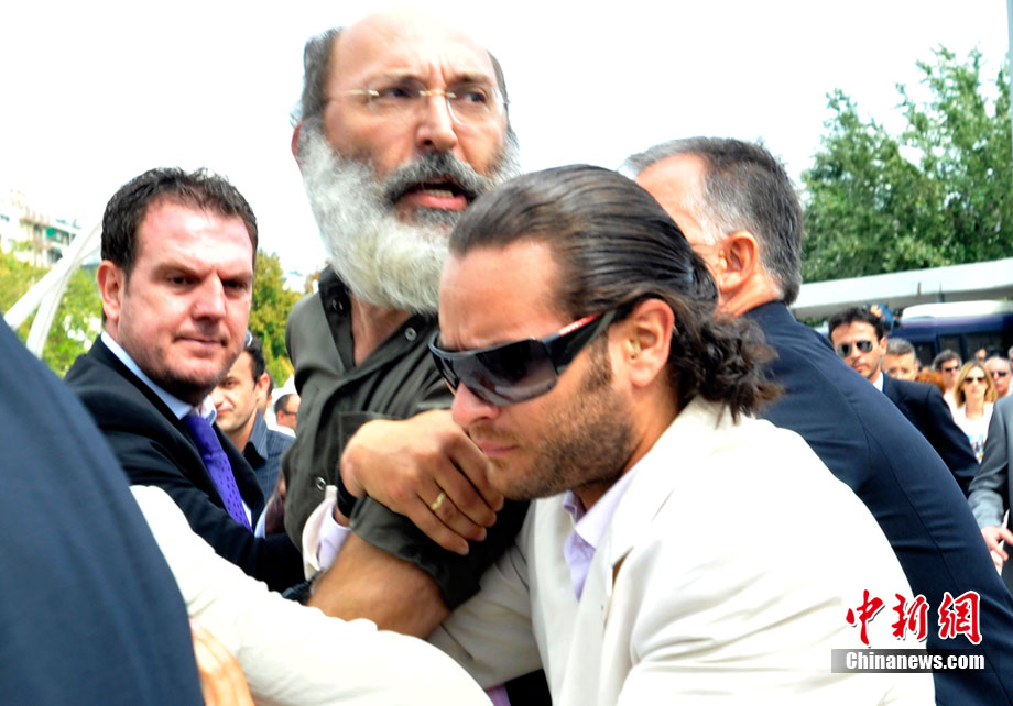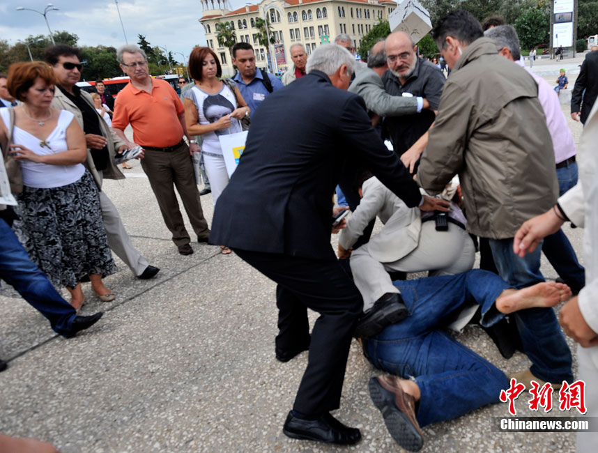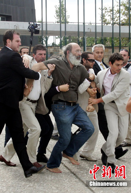 當(dāng)?shù)貢r(shí)間9月11日,在希臘北部城市塞薩洛尼基,希臘總理帕潘德里歐參觀塞薩洛尼基國(guó)際博覽會(huì)時(shí)遭一男子擲鞋襲擊,但沒有被鞋擊中。