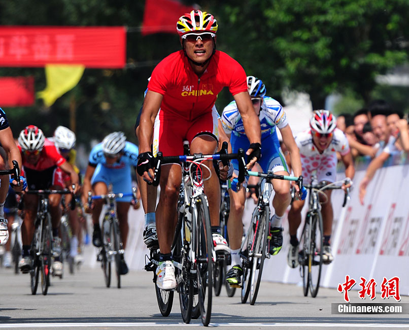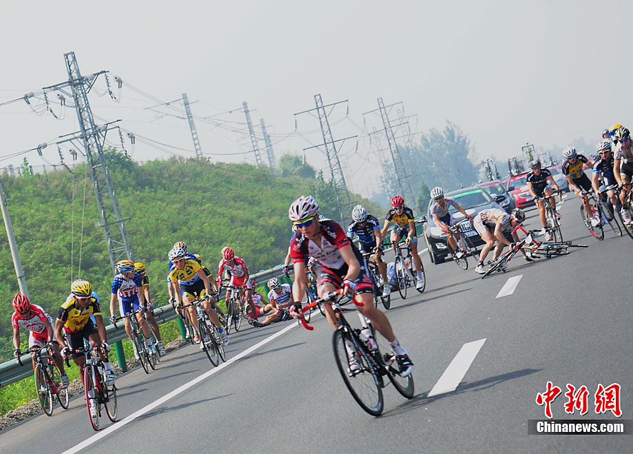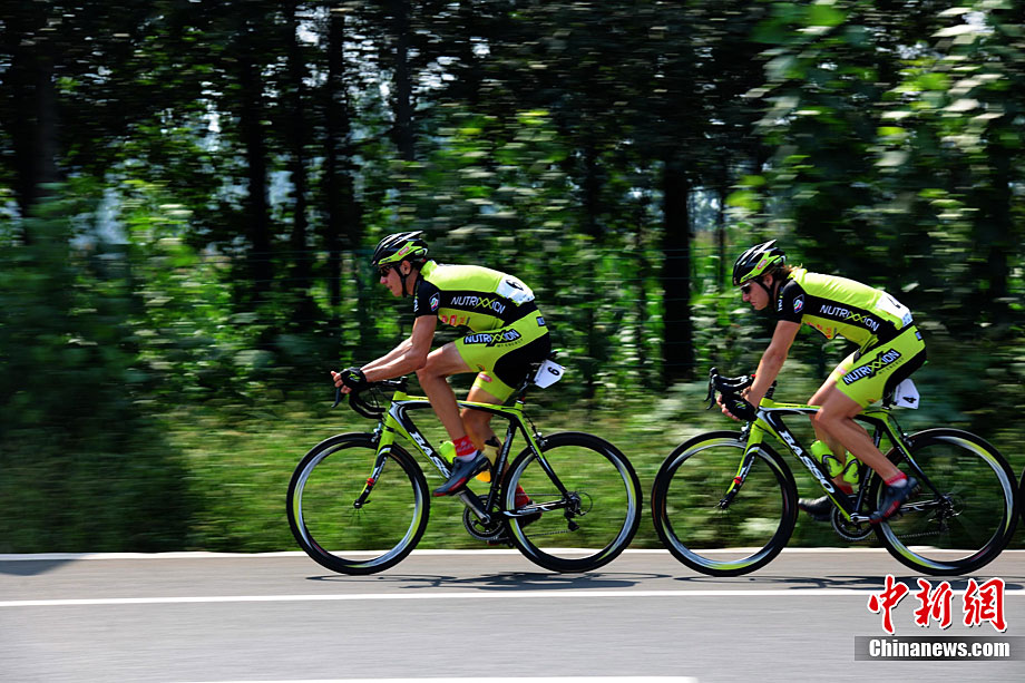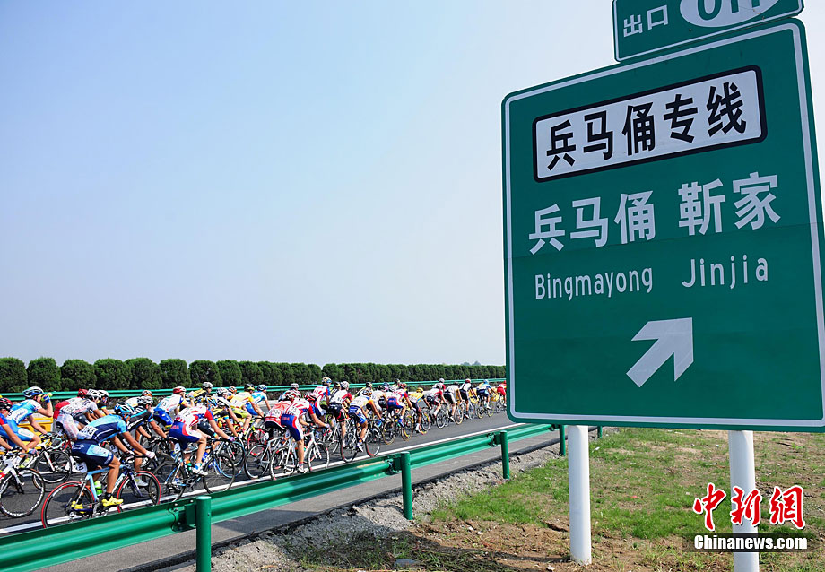 9月12日上午,首屆環(huán)中國(guó)國(guó)際公路自行車(chē)賽進(jìn)入第二賽段,由西安前往華山,全程118公里。圖為德國(guó)紐特里什車(chē)隊(duì)的一些選手們?cè)诟咚俟飞巷w速前進(jìn)。中新社記者 侯宇 攝