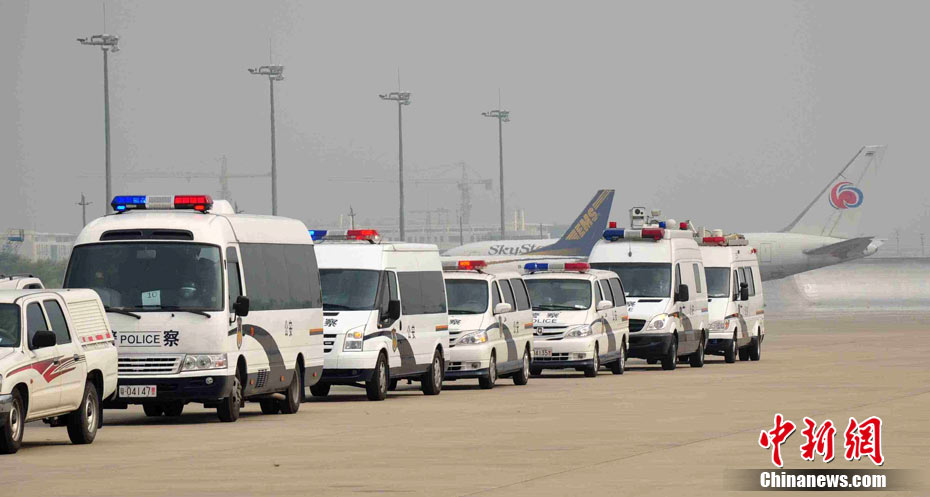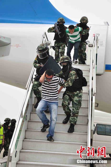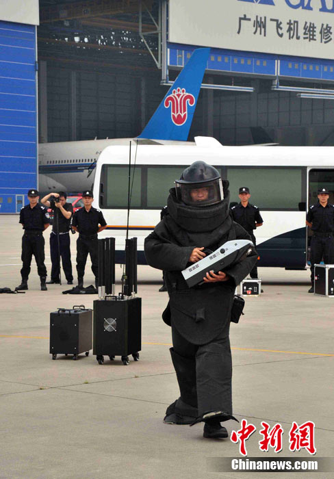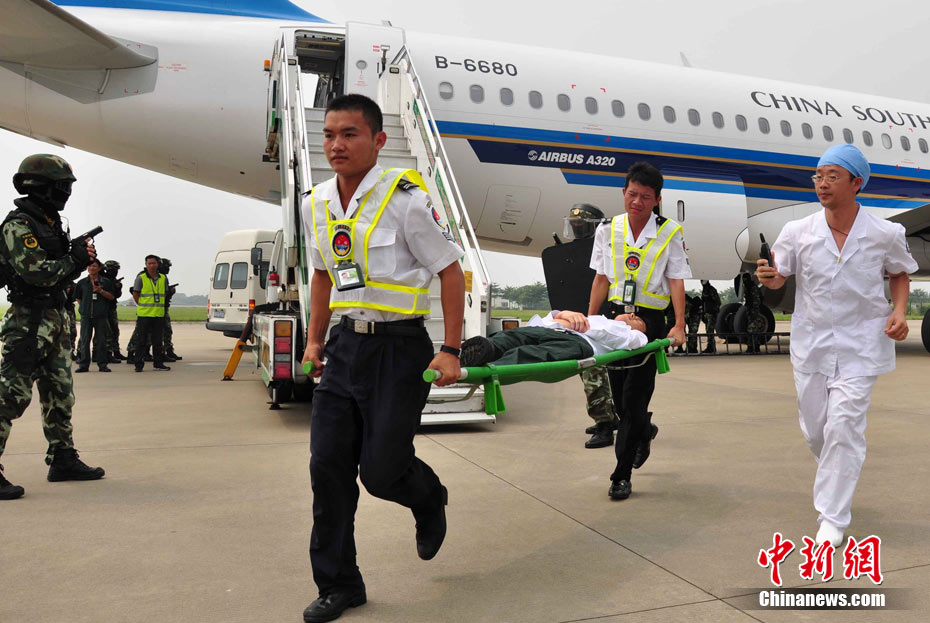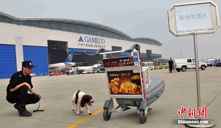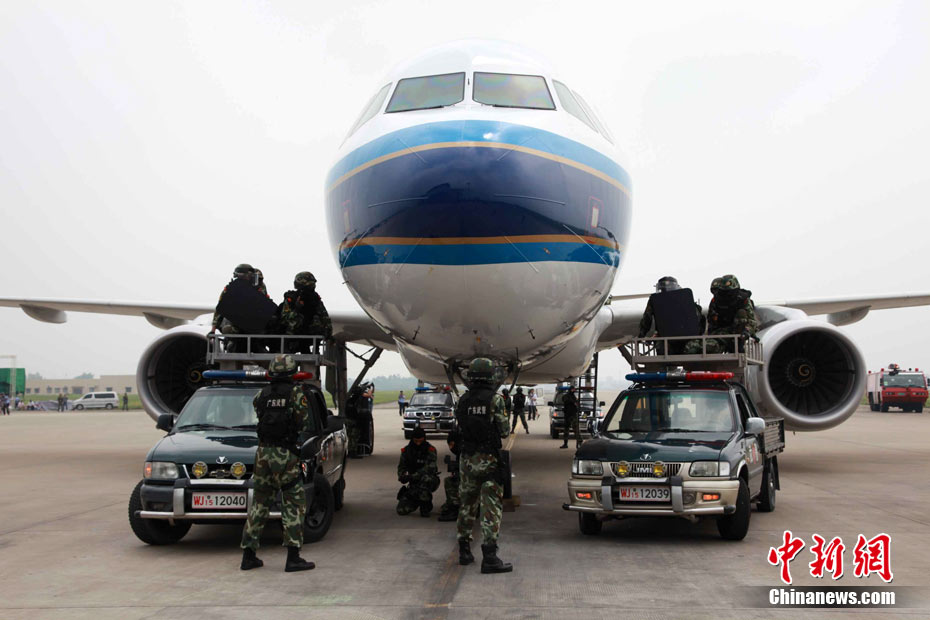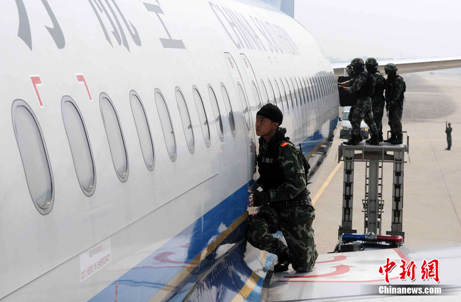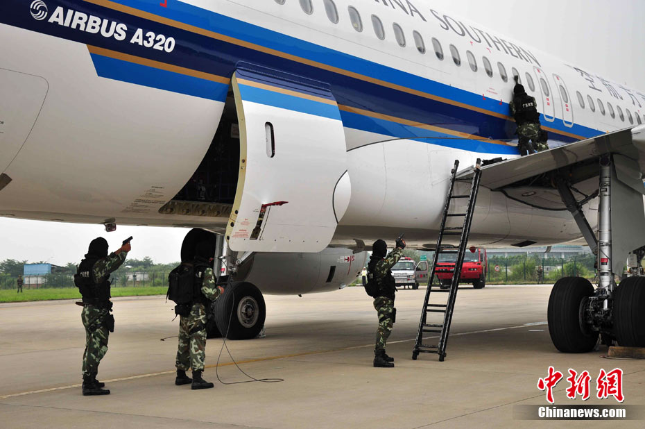 為確保平安亞運(yùn)的目標(biāo),提升白云機(jī)場(chǎng)的反恐能力,9月12日下午,白云機(jī)場(chǎng)亞運(yùn)安保力量重裝集結(jié),舉行大規(guī)模的反恐綜合演練。圖為反劫機(jī)特戰(zhàn)隊(duì)員控制飛機(jī)前后艙門(mén)準(zhǔn)備突擊。中新社發(fā) 云軒 攝