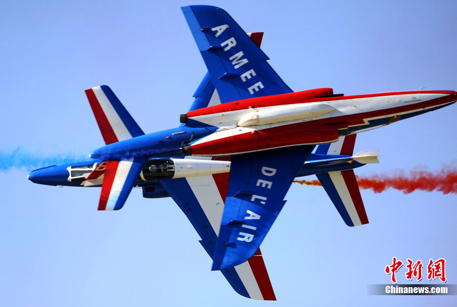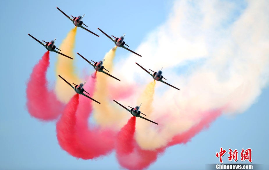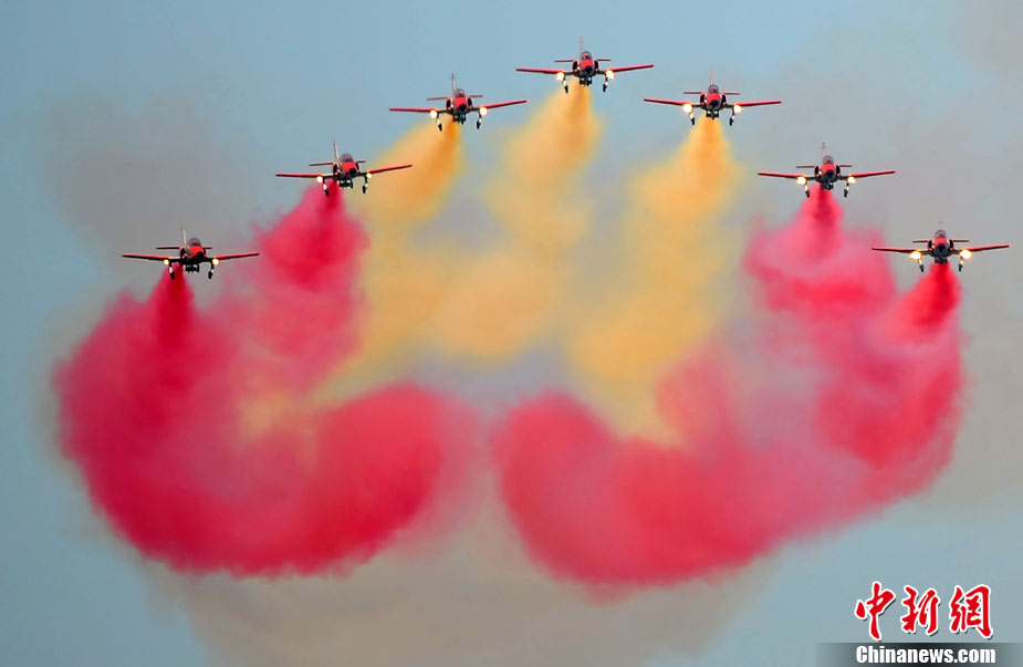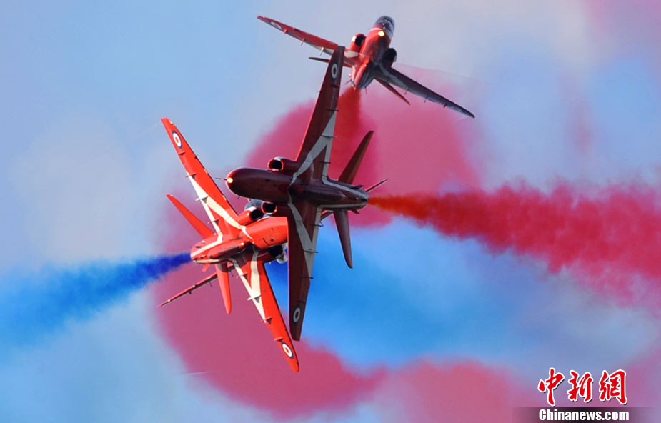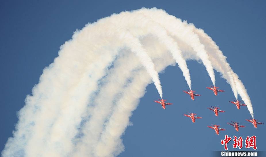 9月12日,為了慶祝意大利“三色箭”特技飛行表演隊成立50周年,多國飛行表演隊“齊聚”意大利,在Rivolto軍事基地進(jìn)行了精彩的空中特技表演。圖為英國”紅箭“飛行表演隊進(jìn)行特技表演。