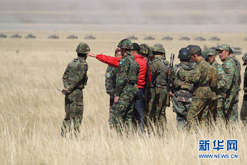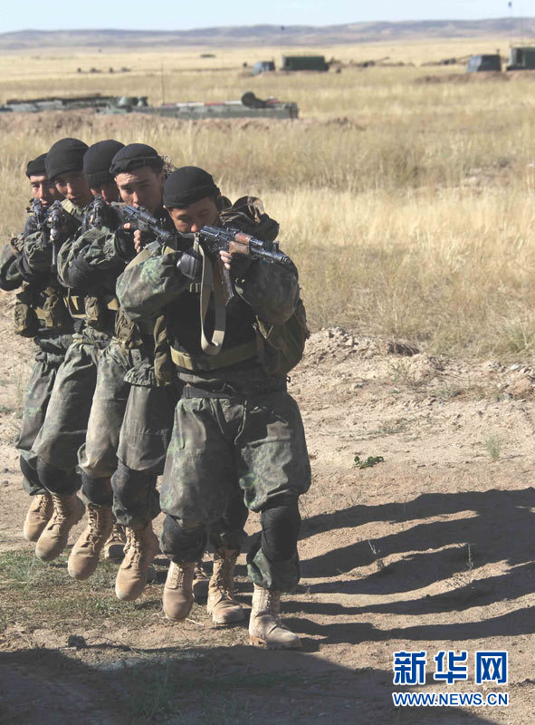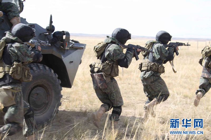 9月15日,參加上海合作組織成員國武裝力量聯(lián)合反恐軍事演習的哈薩克斯坦、中國、吉爾吉斯斯坦、俄羅斯、塔吉克斯坦五國參演部隊成功舉行第二次實兵合練。王建民 攝 圖片來源:新華網