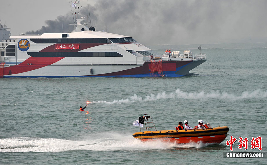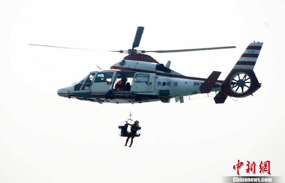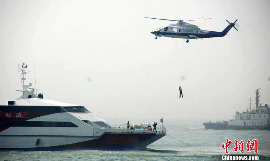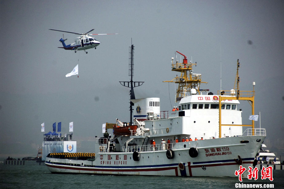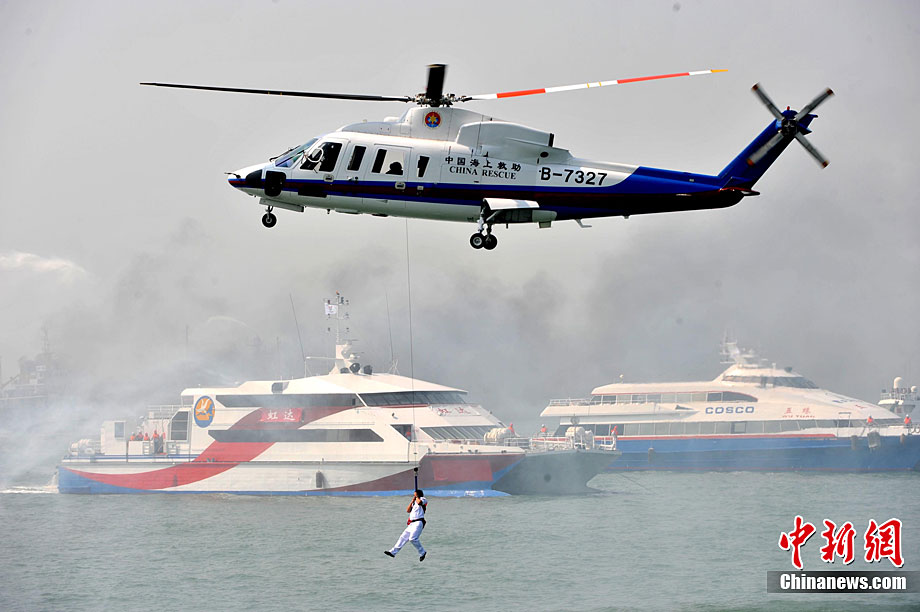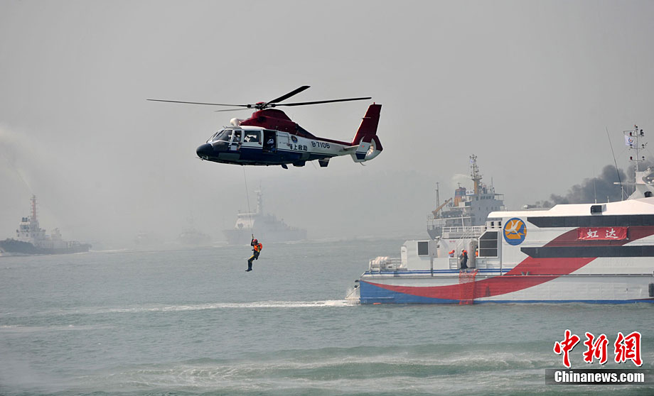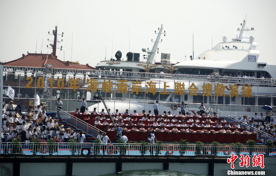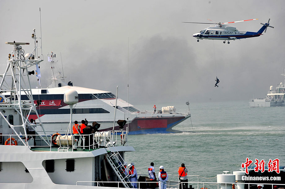 9月16日上午,2010年海峽兩岸海上聯(lián)合搜救演練在臺(tái)灣海峽的廈門、金門附近海域舉行。海峽兩岸海上搜救單位參演人數(shù)400多人,共動(dòng)用搜救船舶14艘、救助飛機(jī)3架。其中大陸方面主要參演船舶9艘、救助直升機(jī)2架;臺(tái)灣方面主要參演船舶5艘、救助直升機(jī)1架。這是自2008年12月15日兩岸海上直航正式啟動(dòng)以來(lái),海峽兩岸海上搜救力量首次共同進(jìn)行的大規(guī)模海陸空聯(lián)合搜救演練。圖為演練現(xiàn)場(chǎng)。中新社發(fā) 王東明 攝