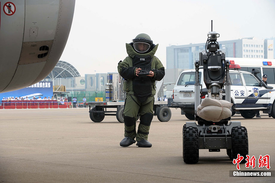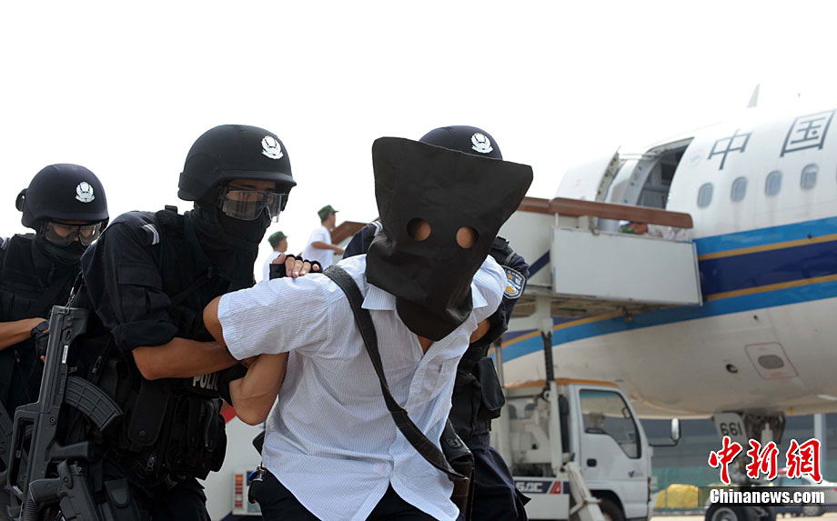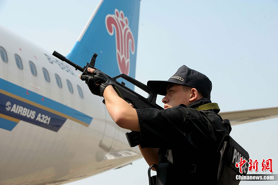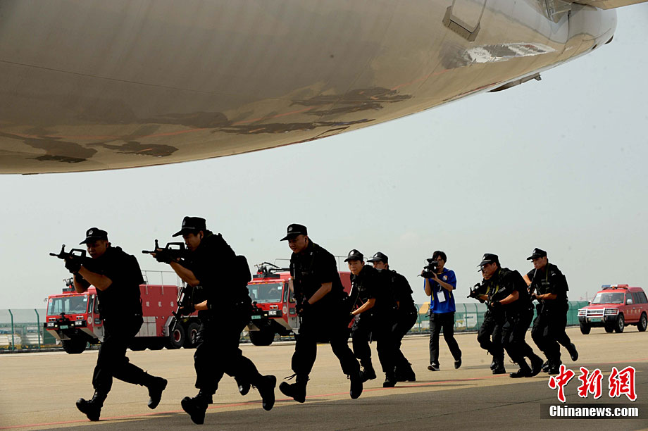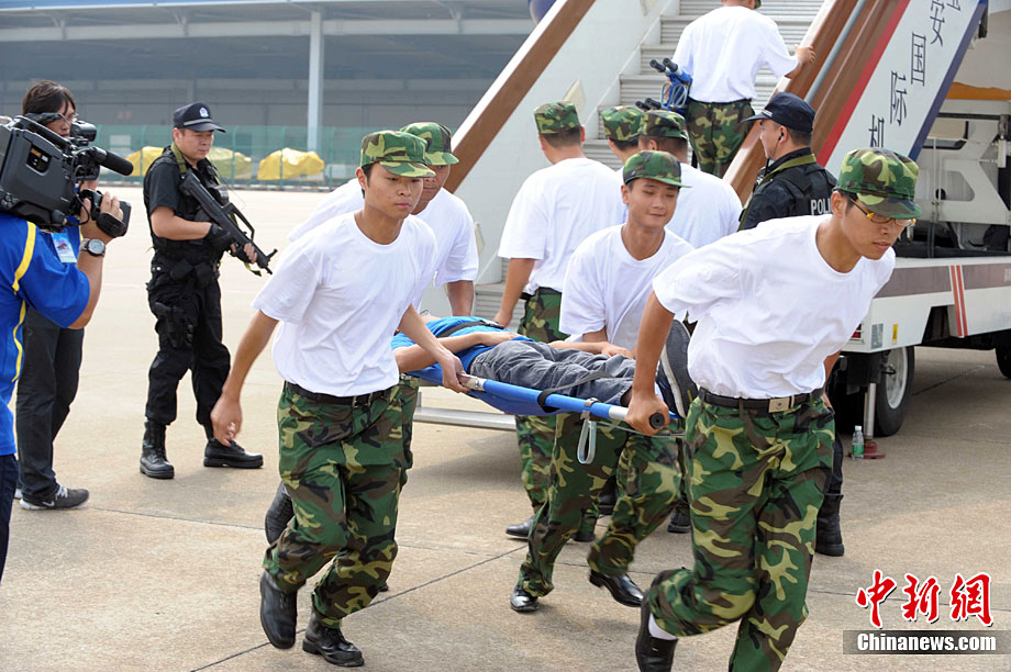 9月16日,深圳寶安國際機場舉行反恐應急演習,模擬一架客機被歹徒劫持后,特警、防爆、消防、醫(yī)療救護等各方面展開營救,在短時間內解救人質處理事故。中新社記者 陳文 攝