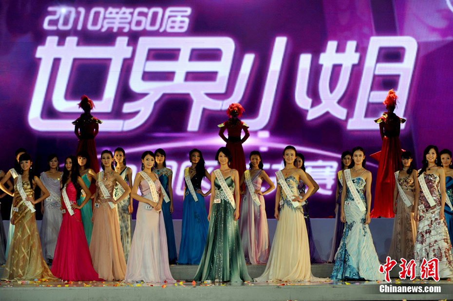 9月17日晚,參加第60屆世界小姐中國區(qū)總決賽的32位佳麗在深圳東部華僑城華麗上演,2號參賽佳麗唐瀟(中)、11號佳麗葛譯鴻(左)、21號佳麗許繼丹(右)分別奪得大賽冠、亞、季軍。中新社記者 陳文 攝