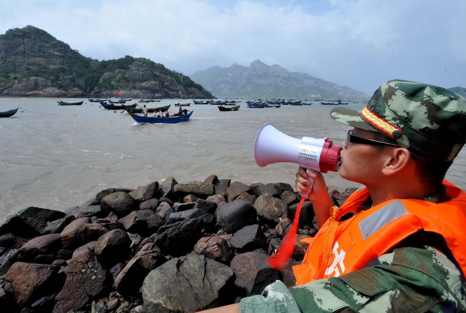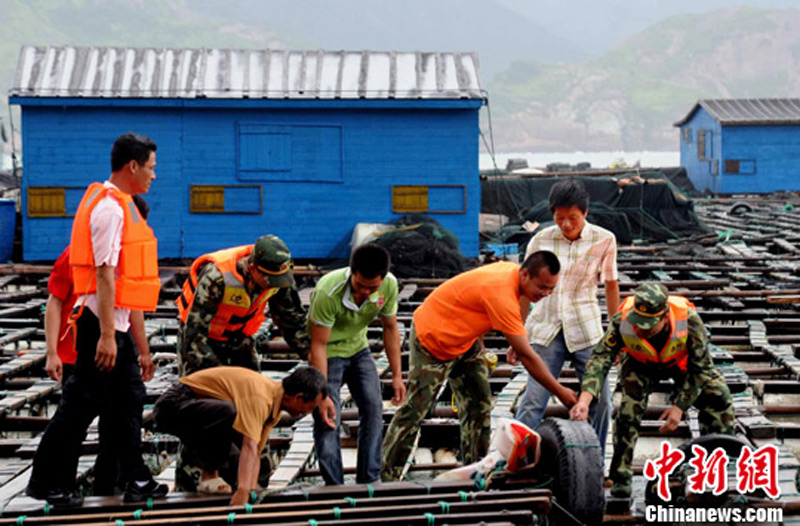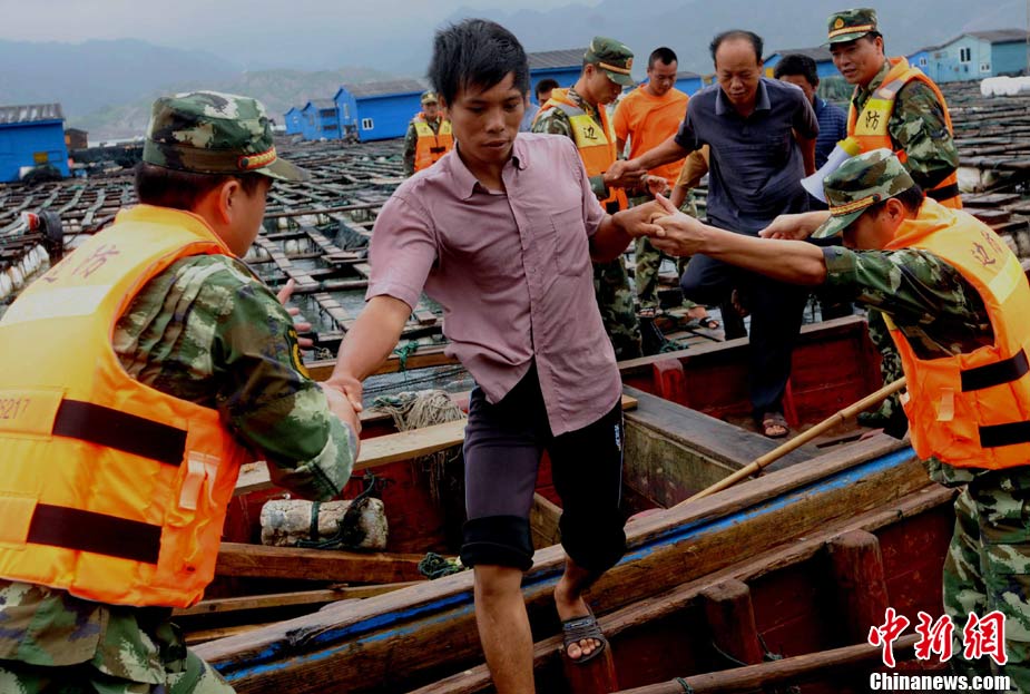 9月20日7時,今年第11號臺風“凡亞比”在福建省漳浦縣沿海登陸。圖為9月19日傍晚,福州連江縣邊防官兵冒著大風幫助漁排養(yǎng)殖人員加固漁排并緊急轉(zhuǎn)移該縣可門海上養(yǎng)殖區(qū)內(nèi)漁排養(yǎng)殖人員。劉可耕 攝