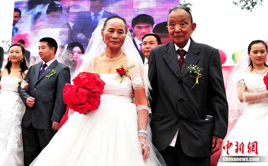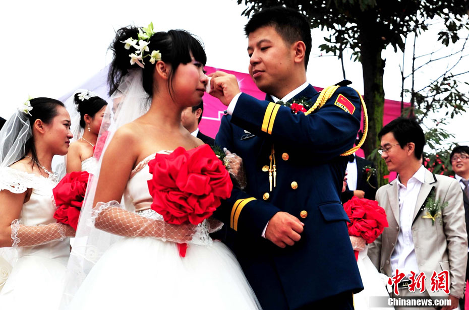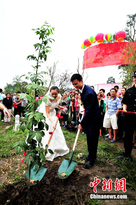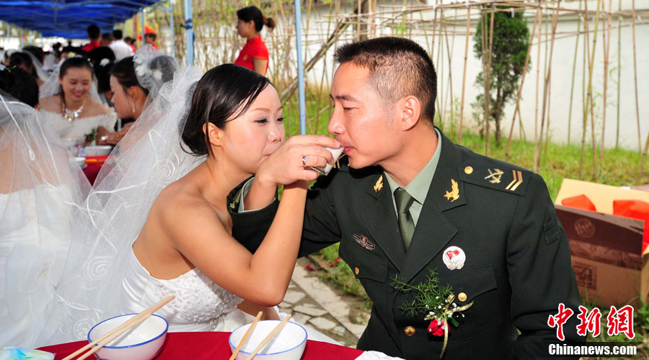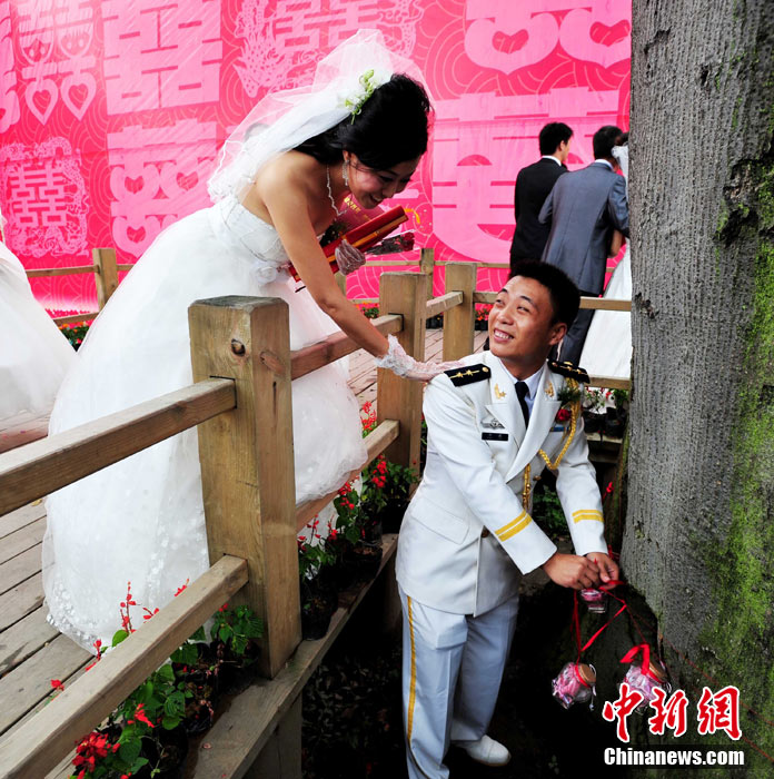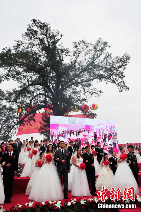 9月22日中秋佳節(jié)之際,99對參與過抗震救災及災后重建的新人,在四川省什邡市紅豆村的千年紅豆樹下,互許終身,共慶婚禮。圖為新人們在千年紅豆樹下見證愛情,同拋新娘捧花。中新社發(fā) 安源 攝