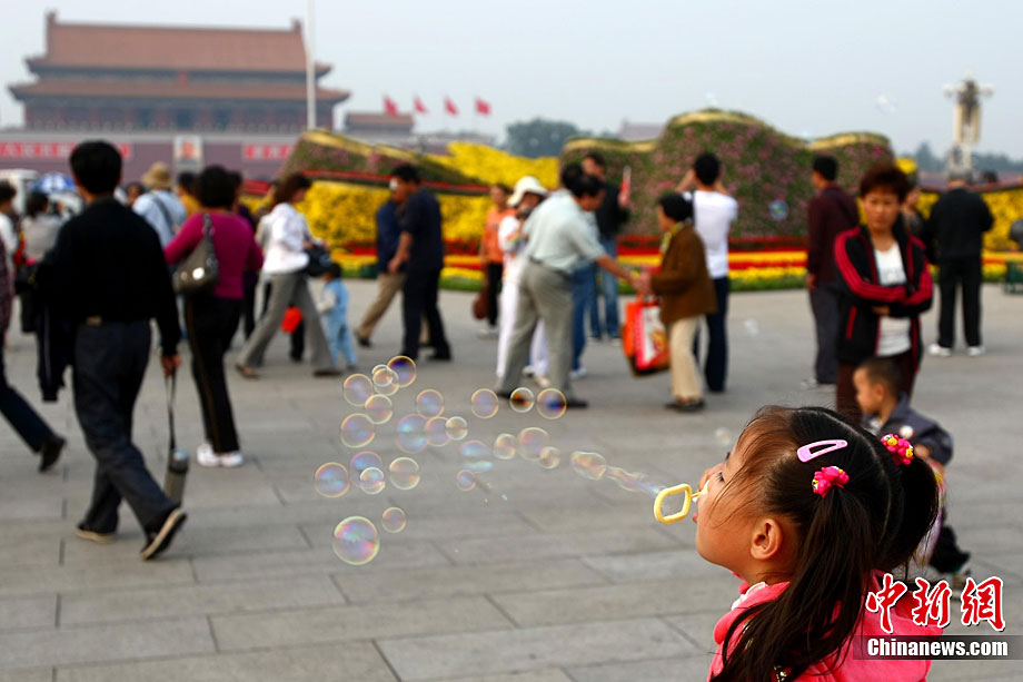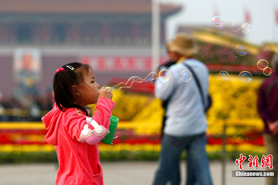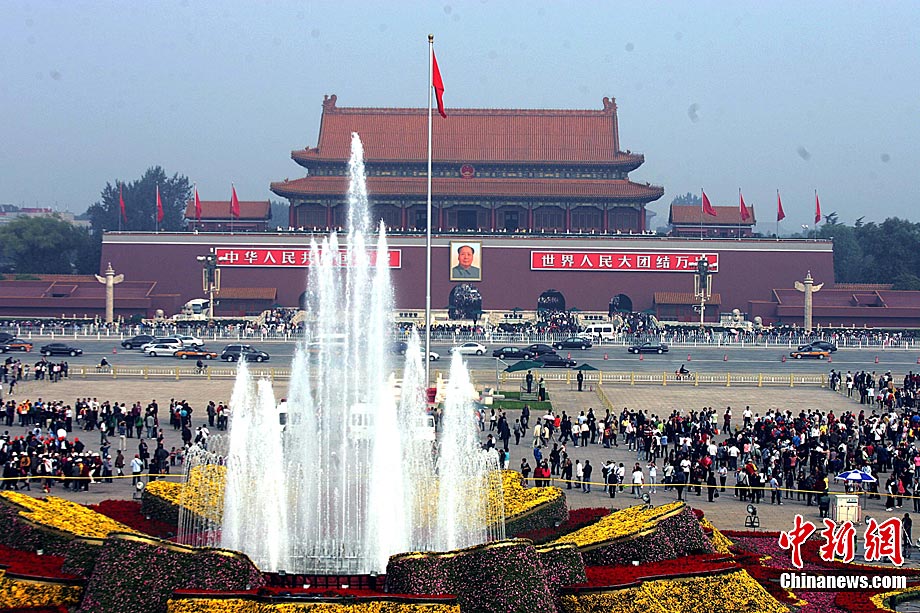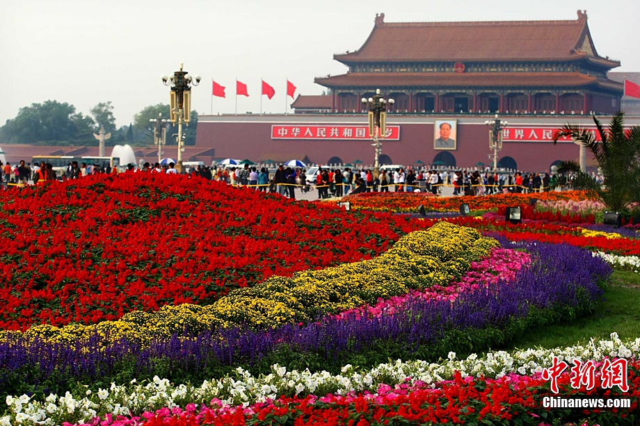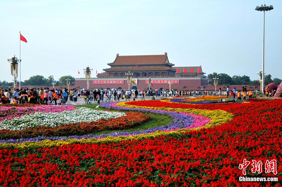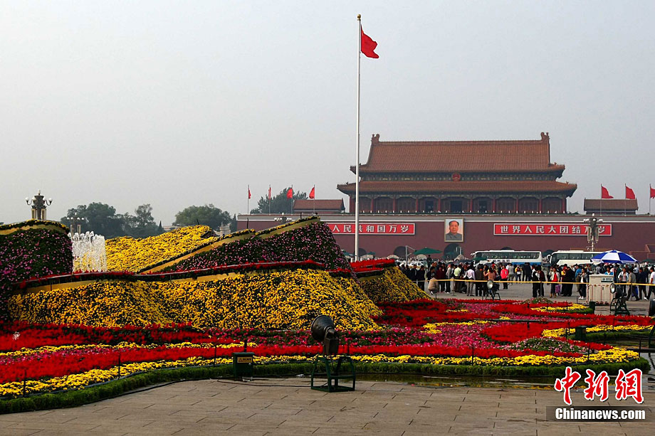 9月25日上午,北京市園林綠化局宣傳中心對(duì)外宣布,為了迎接建國(guó)61周年,天安門廣場(chǎng)主題為“花開盛世”的中心水法花壇已經(jīng)安裝完畢并正式亮相。吳間道 攝 圖片來(lái)源:cnsphoto