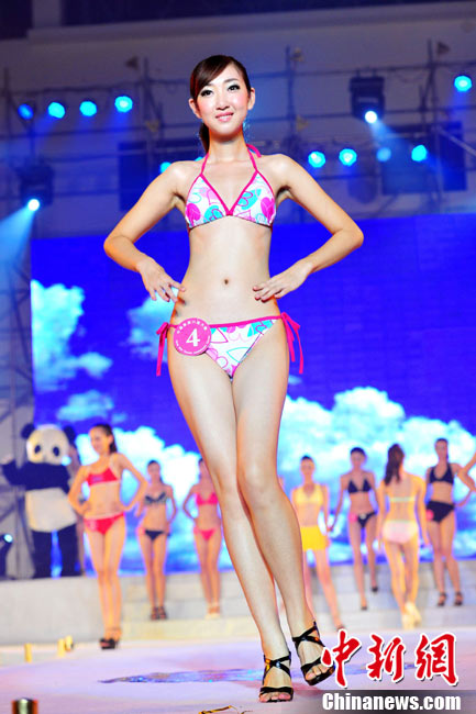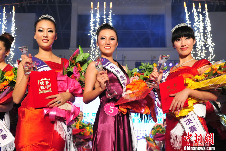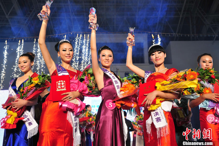 9月26日晚,2010中華旅游小姐大賽中國總決賽暨劍門關(guān)旅游形象大使選拔賽在四川省劍閣縣落下帷幕。40名佳麗們先后通過了熱情奔放的活力裝展示、風情萬種的泳裝展示、雍容典雅的晚禮裝展示以及才藝表演、休閑裝展示后,經(jīng)評委們認真評判,最終本賽季8個單項獎、十佳選手以及佳麗三甲相繼產(chǎn)生。王子星、李彤、許亞楠分獲冠、亞、季軍,并獲得劍門關(guān)旅游形象大使的殊榮。中新社記者 李學仕 攝