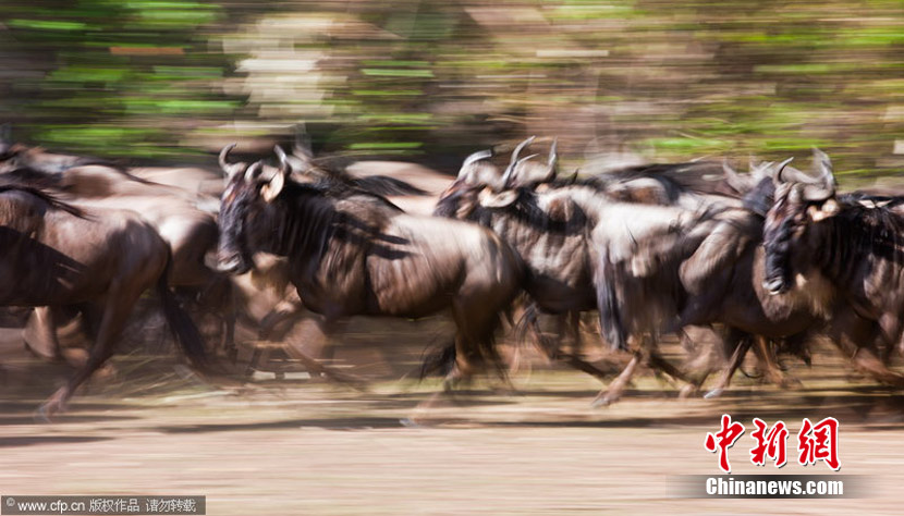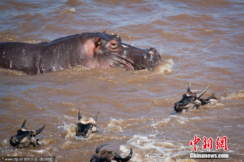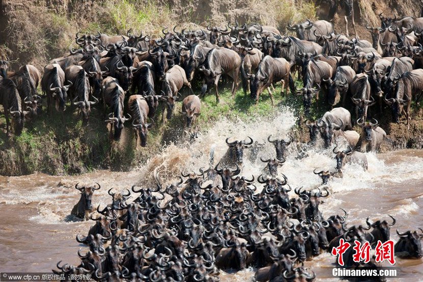 英國兄弟威廉和馬修·伯拉德-盧卡斯日前從倫敦前往非洲進行了為期12天的探險之旅,他們在塞倫蓋蒂國家公園和馬賽馬拉國家保護區(qū)之間的馬拉河畔拍到了230萬只牛羚大遷徙的壯觀景象。馬拉河是長途遷徙的牛羚要渡過的最后一條河,在這里,牛羚的兩大天敵都在等待著它們,一種是世上最大、最為兇殘的尼羅鱷,另一種則是被稱為“非洲河王”的河馬。它們潛伏在水中,等待著牛羚渡河時飽餐一頓。而且在這種時候,就連周圍草原里的獵豹等猛獸也會來分一杯羹。但每年春秋兩季,牛羚都會從這里涉水而過,遷徙到遠方尋找水草豐美的“伊甸園”。 圖片來源:CFP視覺中國
