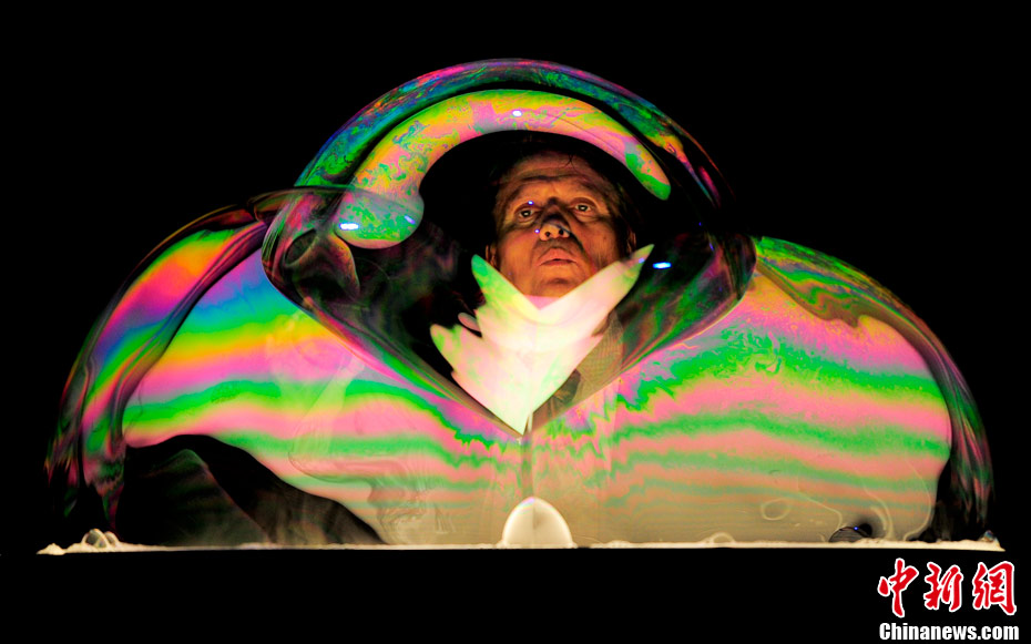 當(dāng)?shù)貢r間10月2日,西班牙肥皂泡魔術(shù)師佩普-布奧表演他的拿手好戲“泡泡秀”。