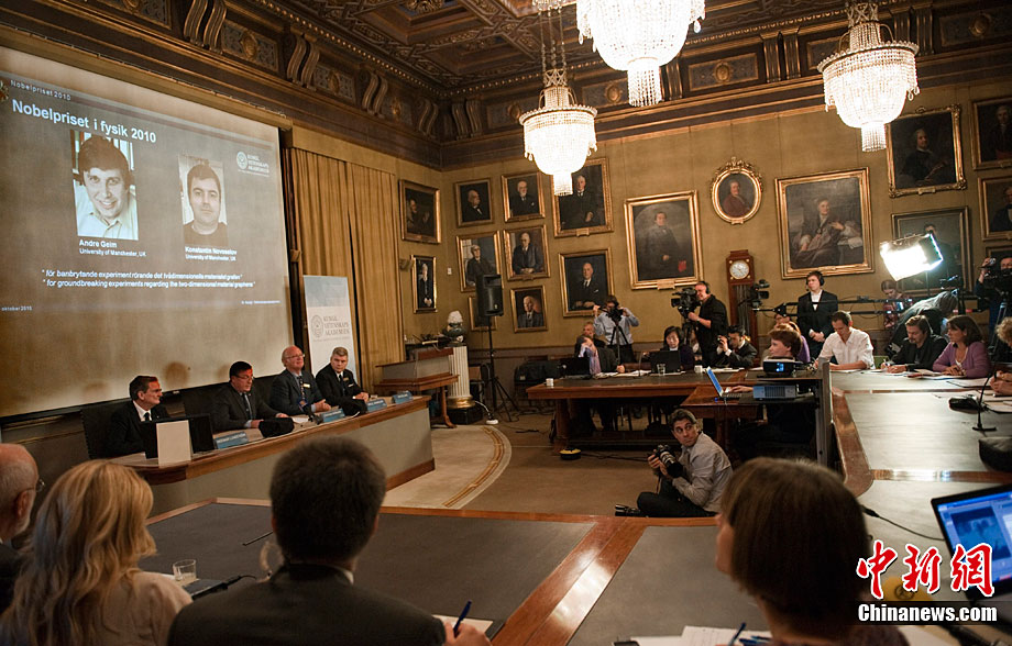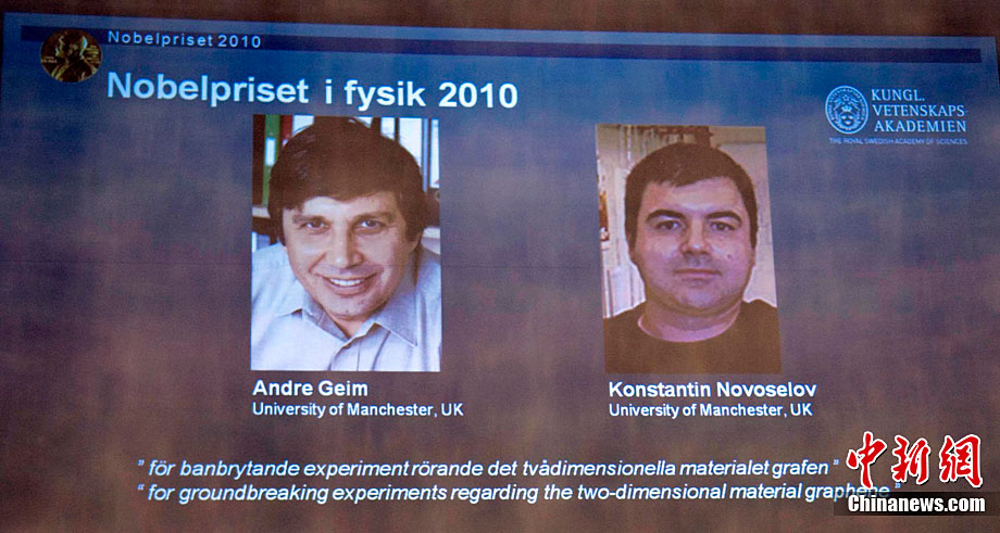 瑞典皇家科學院當?shù)貢r間10月5日宣布,將2010年諾貝爾物理學獎授予英國曼徹斯特大學科學家安德烈·海姆和康斯坦丁·諾沃肖洛夫,以表彰他們在石墨烯材料方面的卓越研究。