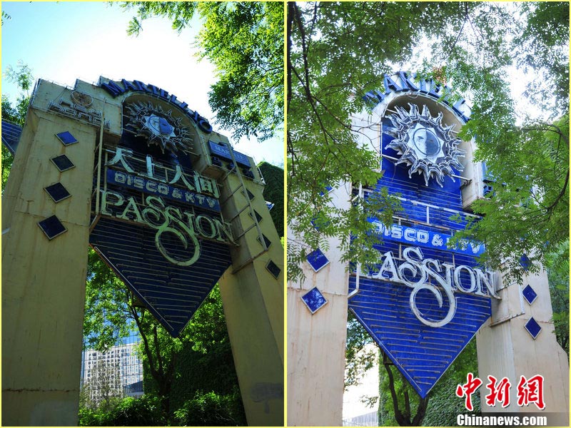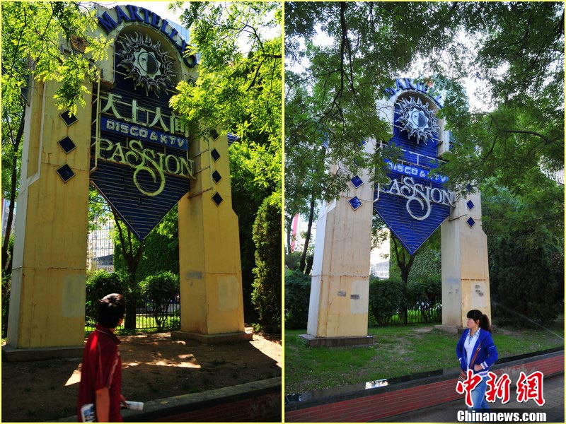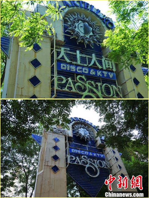 10月5日,北京東三環(huán)北路,蜚聲全國的京城第一夜總會——“天上人間”夜總會的招牌已經(jīng)摘下。此前,因涉嫌有償陪侍,“天上人間”夜總會被勒令停業(yè)整頓。圖為摘牌前后的“天上人間”夜總會。 圖片來源:CFP視覺中國