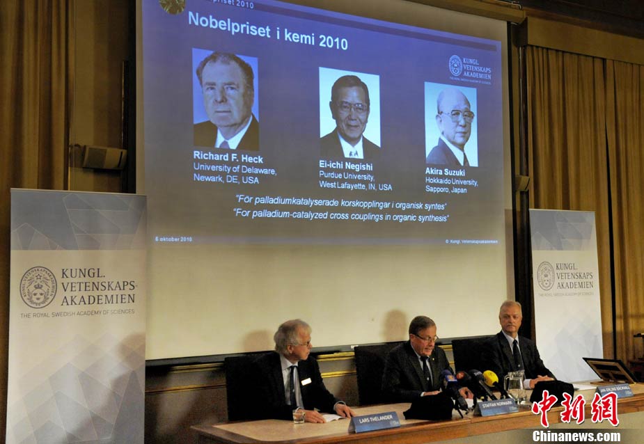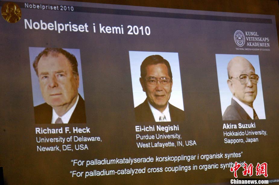 當(dāng)?shù)貢r(shí)間10月6日,瑞典皇家科學(xué)院宣布將2010年諾貝爾化學(xué)獎(jiǎng)授予美國(guó)科學(xué)家理查德-赫克、日本科學(xué)家根岸榮一和鈴木章。
