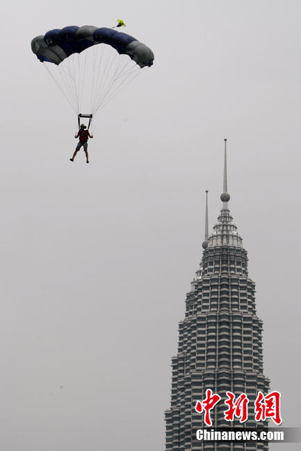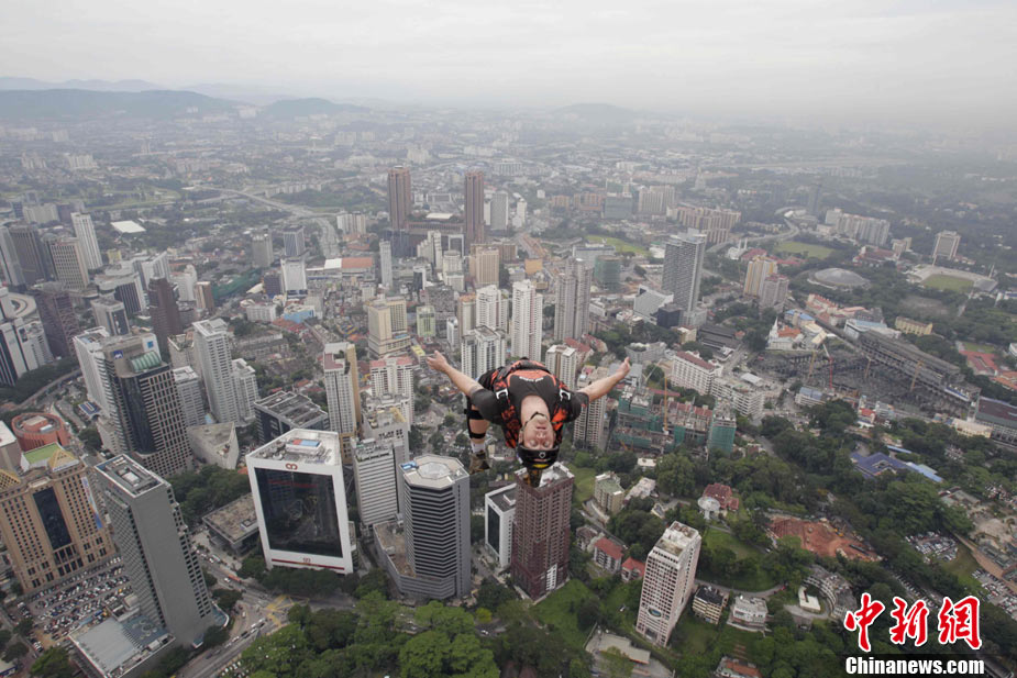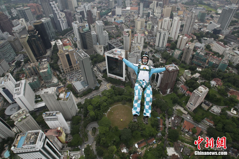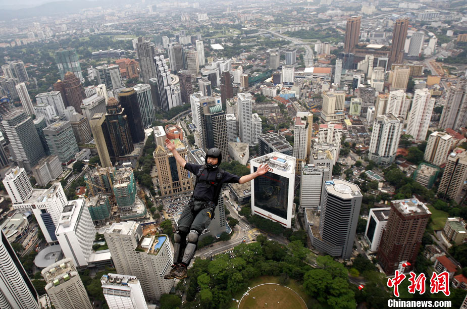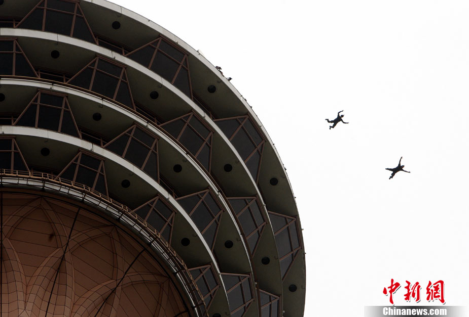 10月7日,幾位極限高手在馬來西亞吉隆坡的雙子高塔上大玩跳躍,體驗(yàn)超乎尋常的刺激感受。