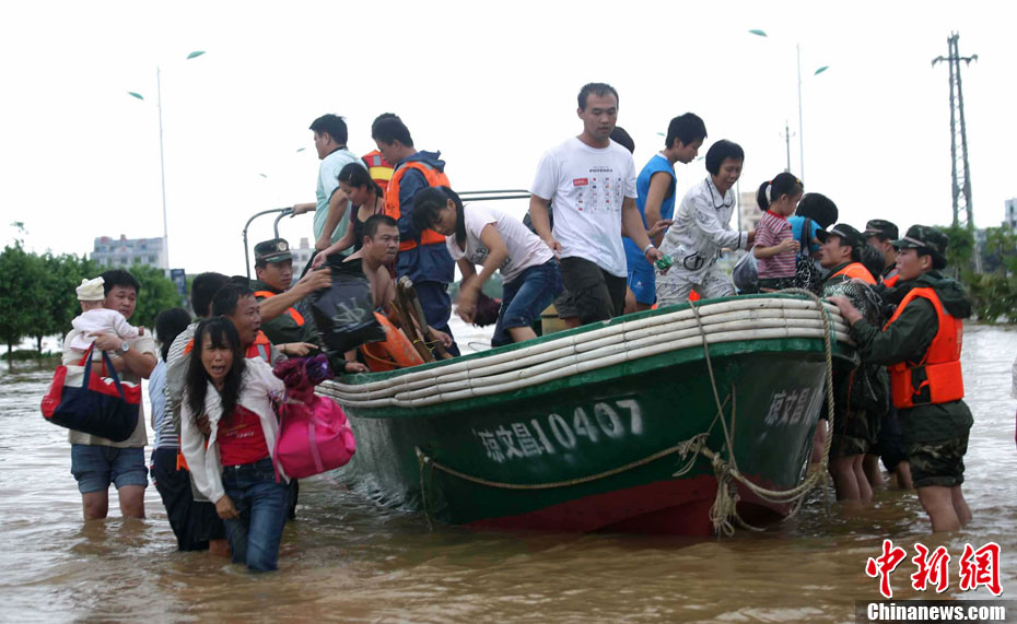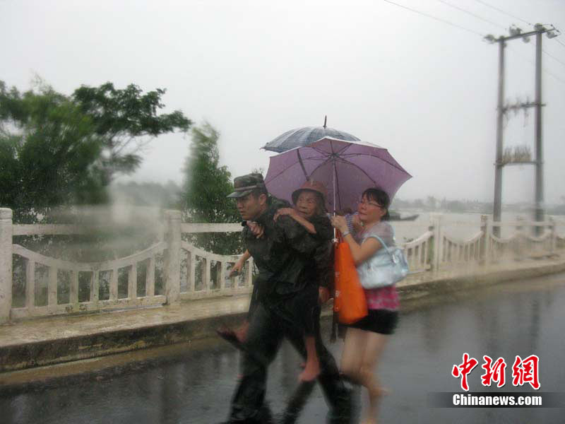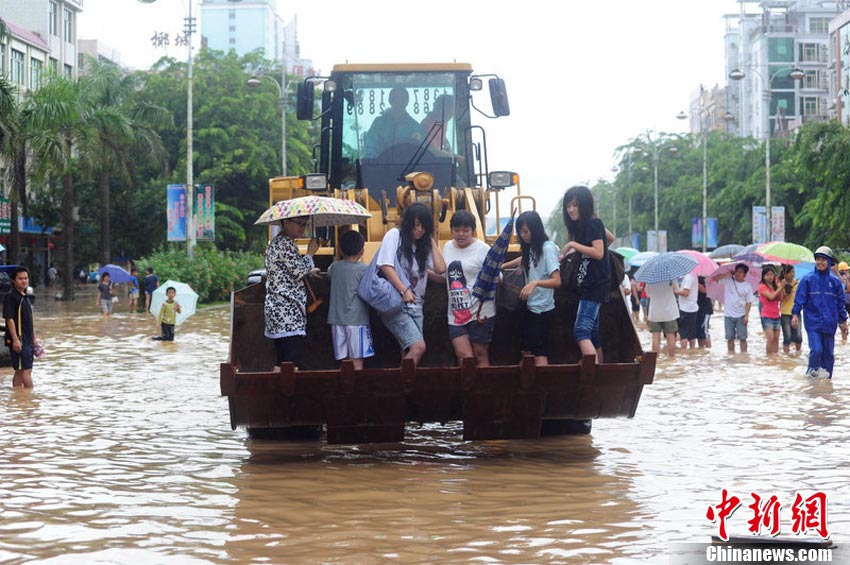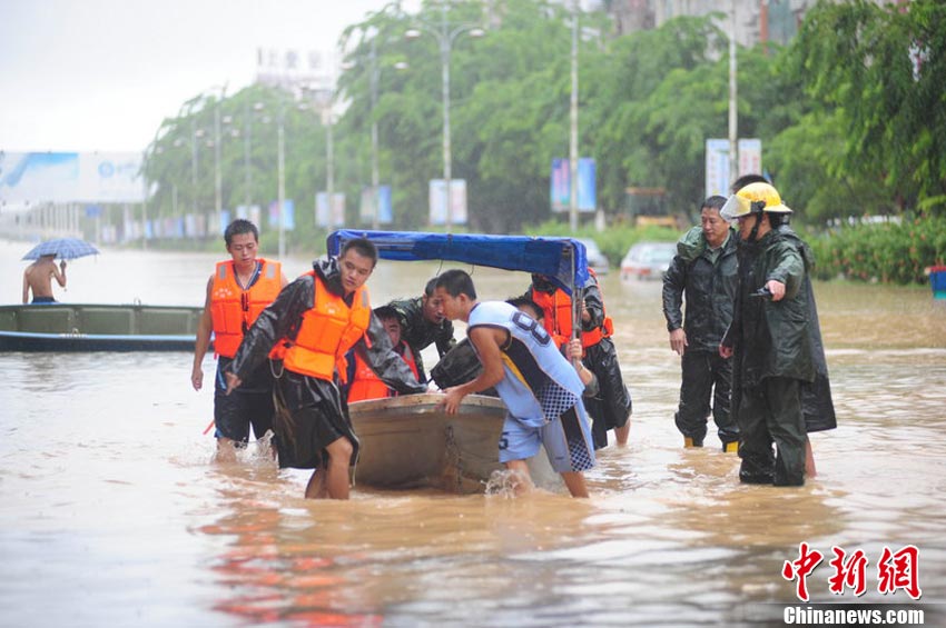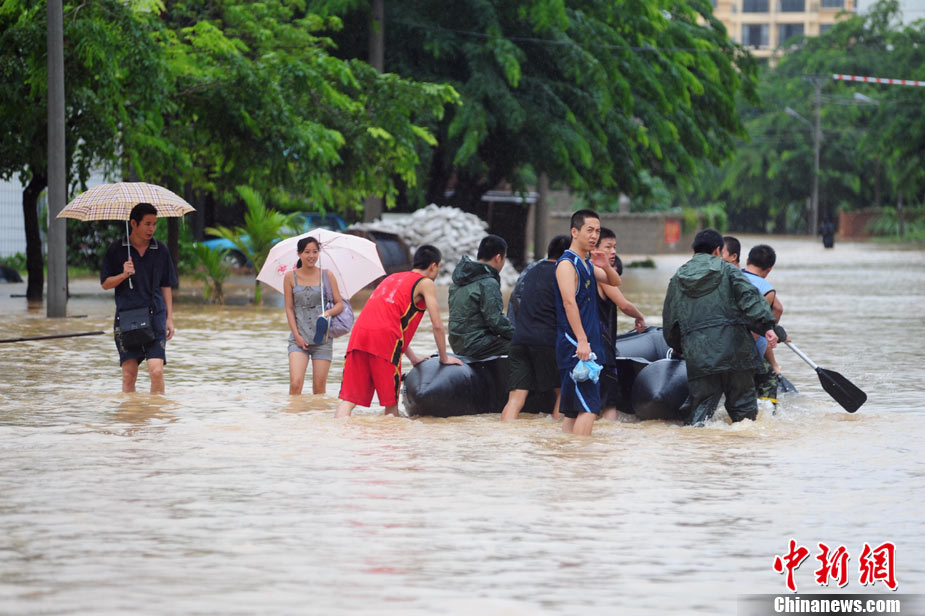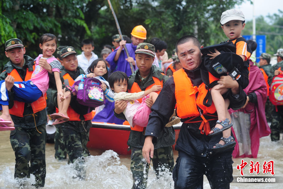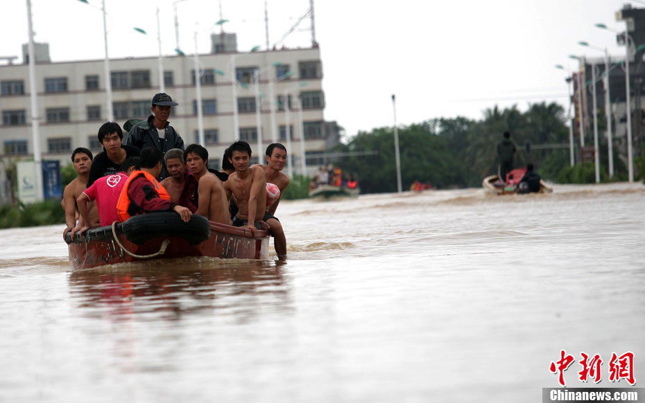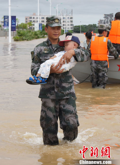 10月8日,海南著名的僑鄉(xiāng)文昌市,當(dāng)?shù)匚渚俦眯⊥⑹忻襁\(yùn)送到安全地帶,連日的暴雨導(dǎo)致文昌城區(qū)全城街道被洪水淹沒(méi)。據(jù)被官兵解救出來(lái)的當(dāng)?shù)孛癖娊榻B,大水已經(jīng)淹至二樓。中新社記者 尹海明 攝