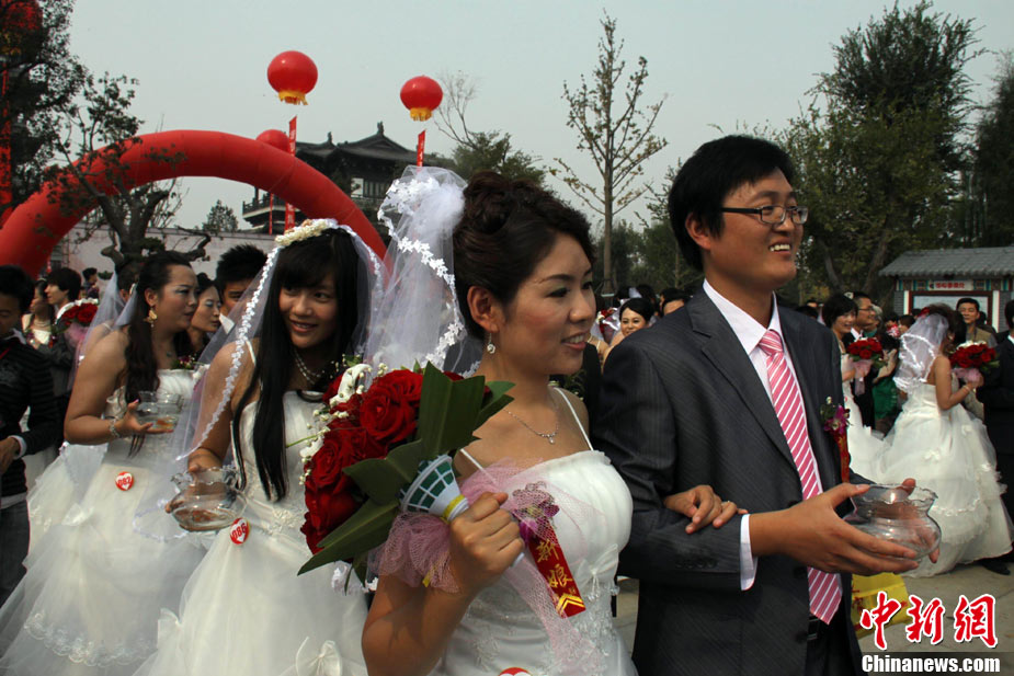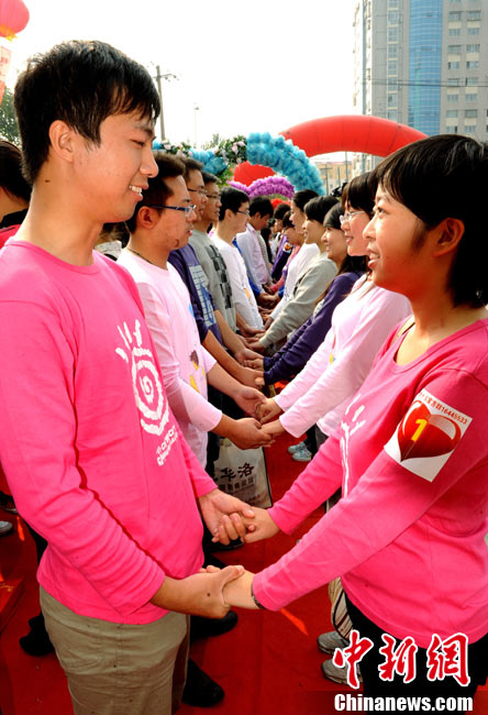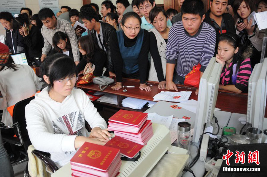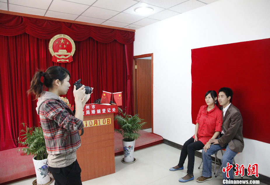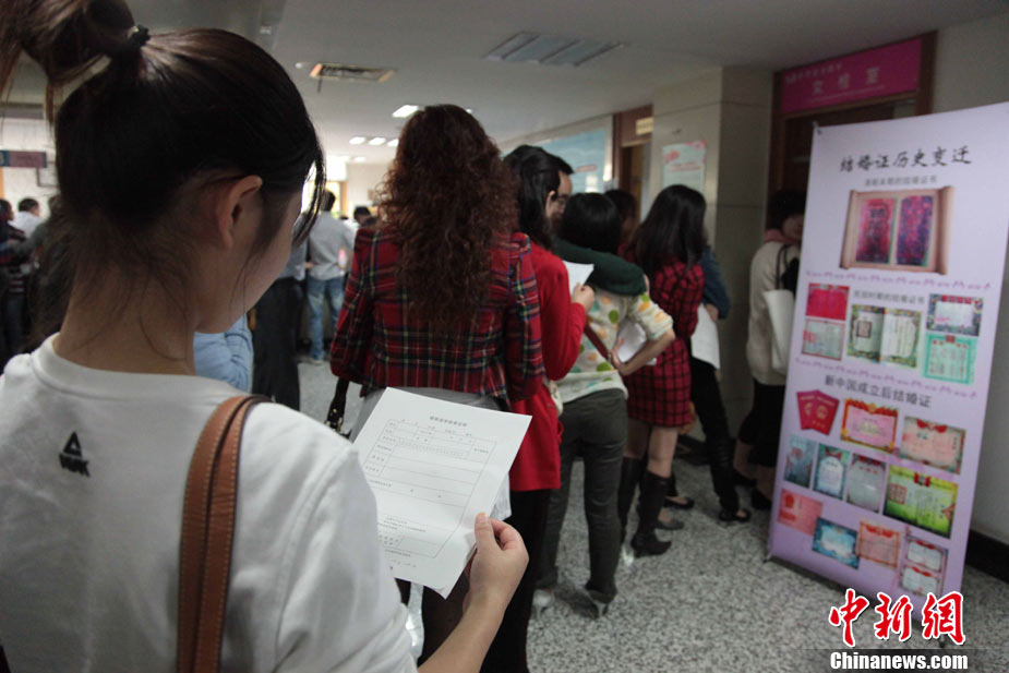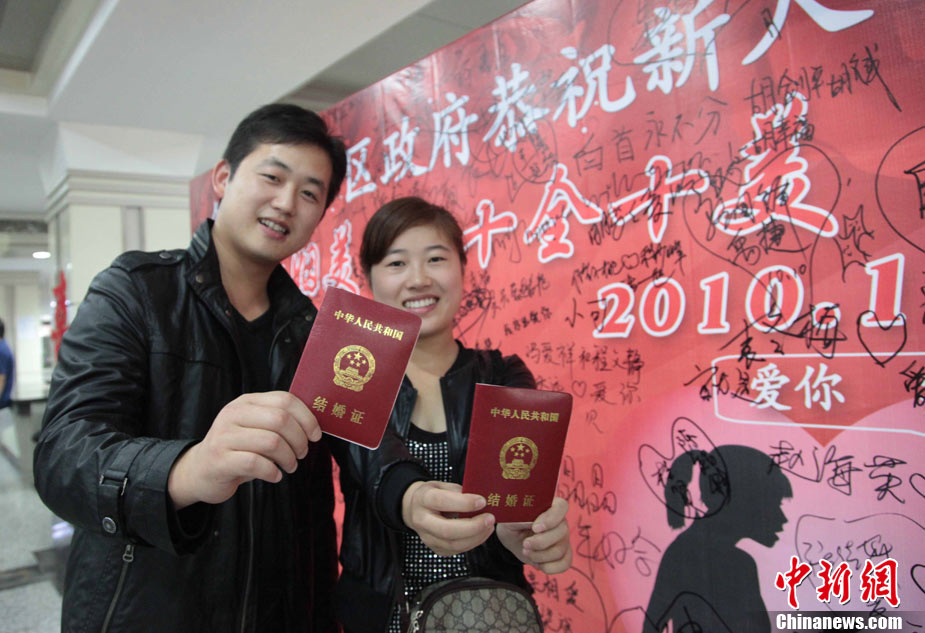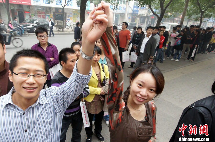 2010年10月10日,全國各地新人辦理結(jié)婚登記。很多新人選擇被寓意“十全十美”的好日子領(lǐng)結(jié)婚證。圖為鄭州出現(xiàn)結(jié)婚登記高峰,導致各區(qū)民政局婚姻登記處門前都排起長長的隊伍。一對新人在長長的隊伍中手挽手排除等候。沙浪 攝 圖片來源:CFP視覺中國