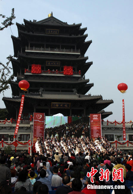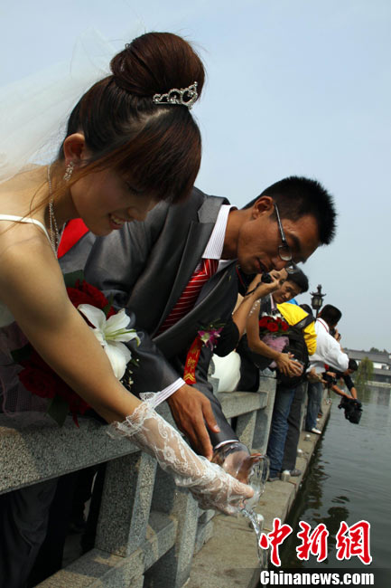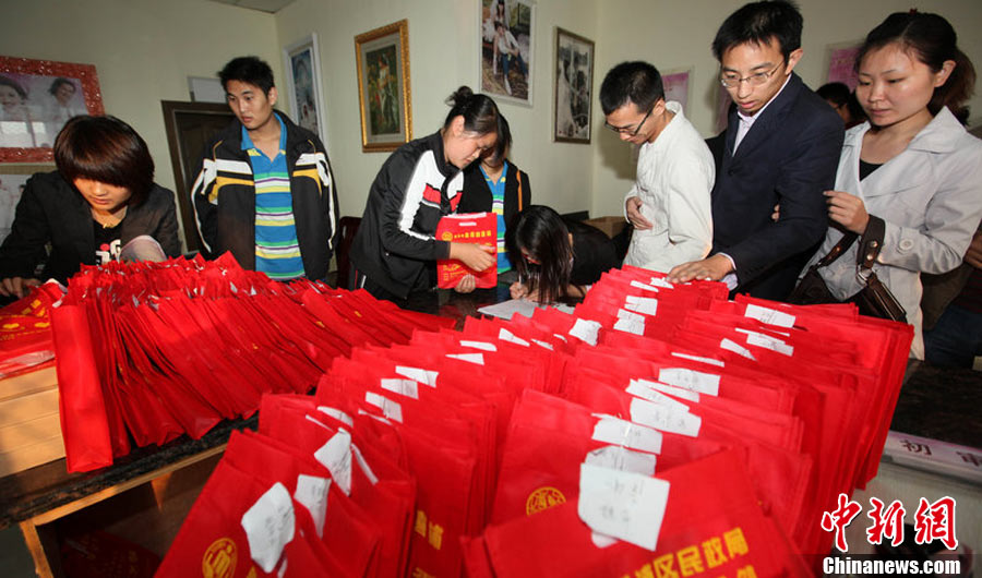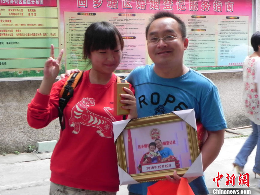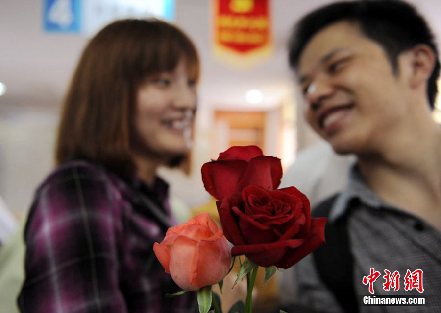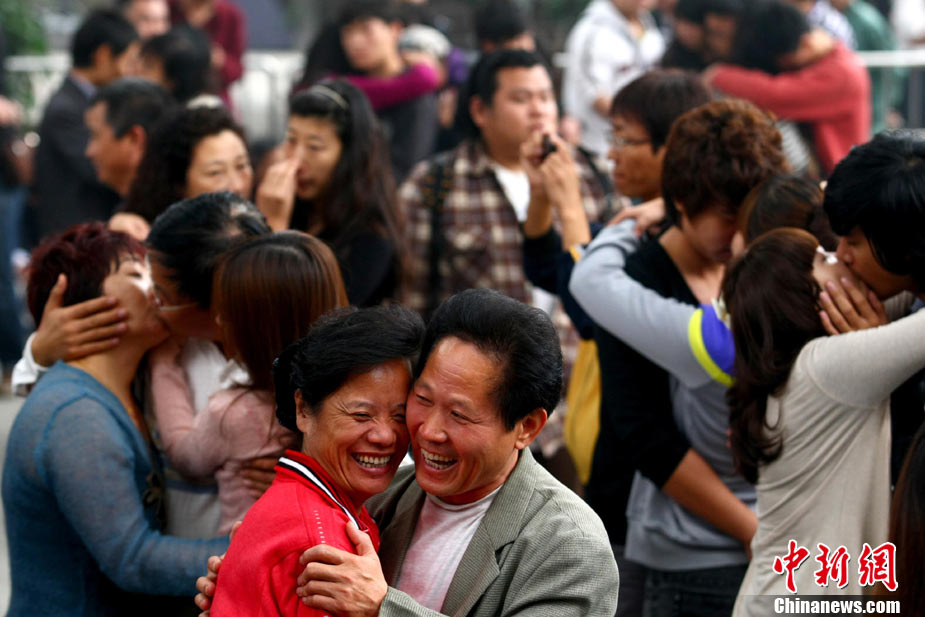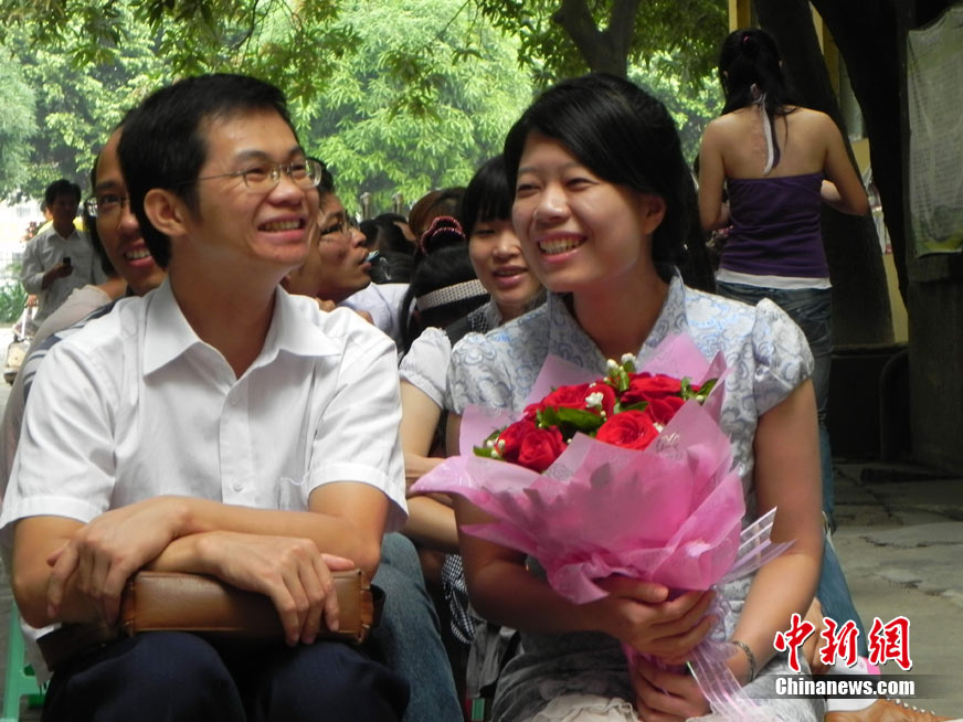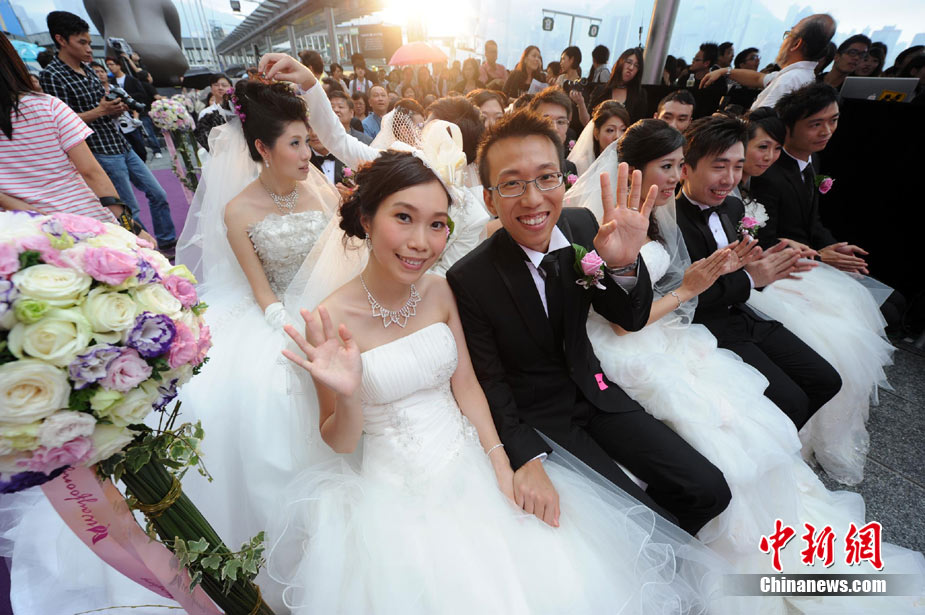 2010年10月10日,全國各地新人辦理結(jié)婚登記。很多新人選擇被寓意“十全十美”的好日子領(lǐng)結(jié)婚證。圖為鄭州出現(xiàn)結(jié)婚登記高峰,導致各區(qū)民政局婚姻登記處門前都排起長長的隊伍。一對新人在長長的隊伍中手挽手排除等候。沙浪 攝 圖片來源:CFP視覺中國