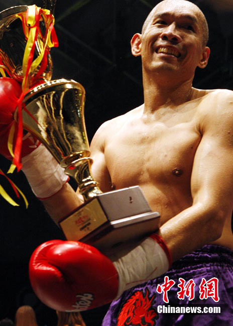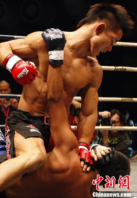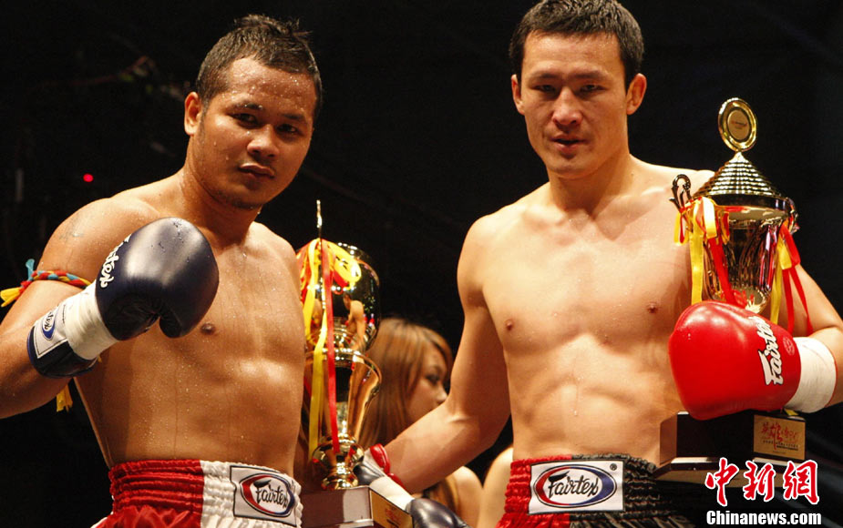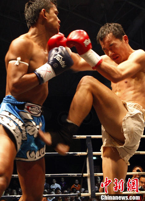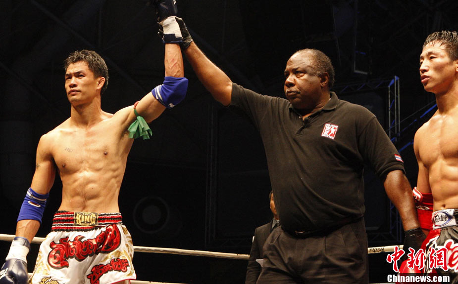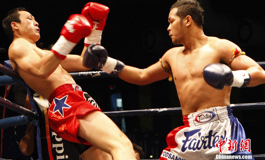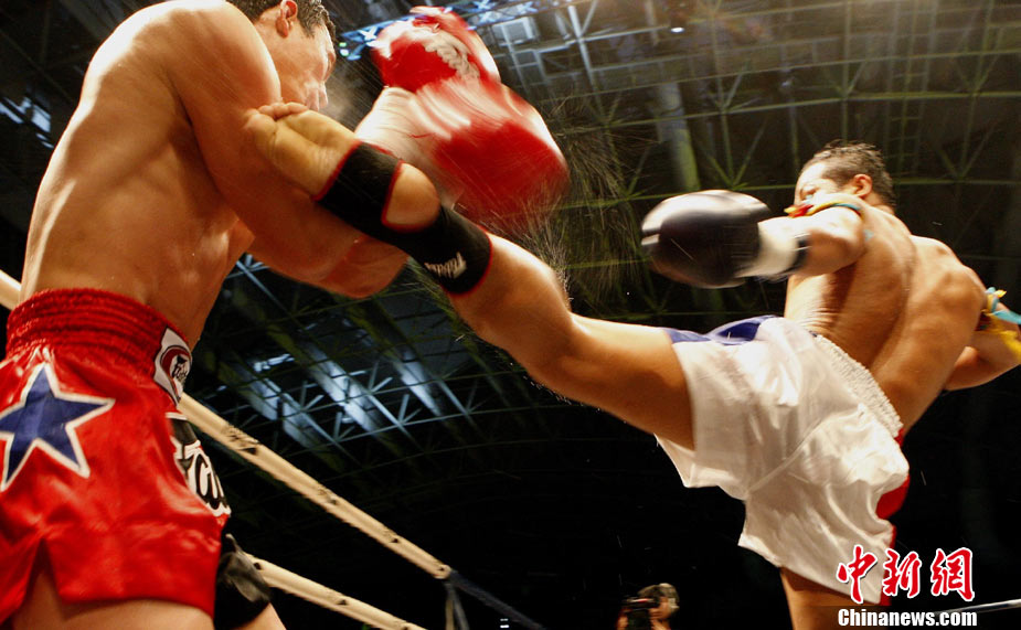 10月9日晚,由馬來西亞IPC國際集團和中國國際文化傳播中心以及英雄傳說賽事機構(gòu)聯(lián)手主辦的“英雄傳說-決戰(zhàn)云頂”世界搏擊王者爭霸賽暨中泰拳王爭霸戰(zhàn)在馬來西亞吉隆坡云頂舉行。圖為泰國拳王雅?巳R與中國王冠對決。 中新社記者 錢興強 攝