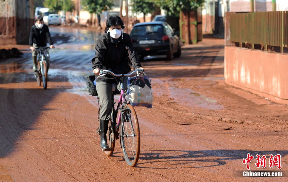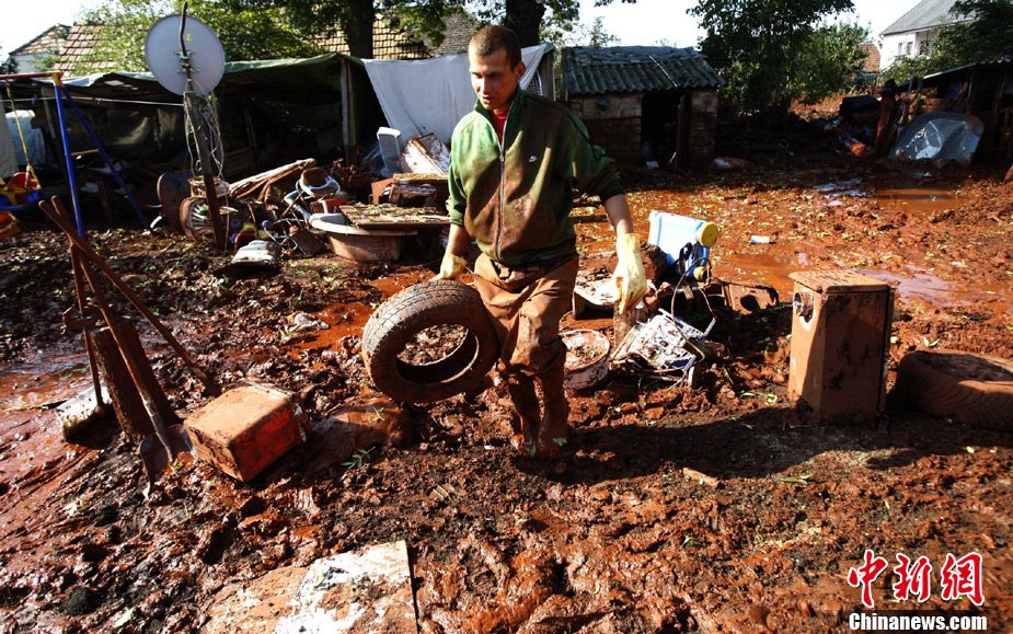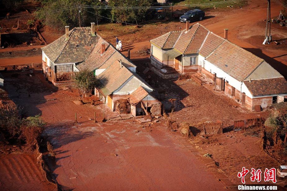 10月12日,匈牙利有毒廢料已擴(kuò)散到河道兩岸以及居民區(qū)。截至目前,基于 “二次泄漏”的威脅,污染最嚴(yán)重的科隆塔爾鎮(zhèn)中已有近1000人被迫離開(kāi)自己的家園。圖為居民經(jīng)過(guò)被污染的路面。