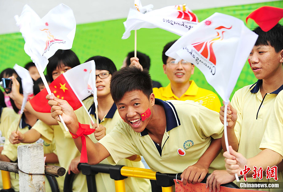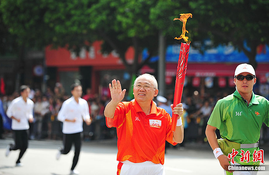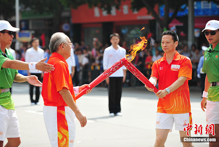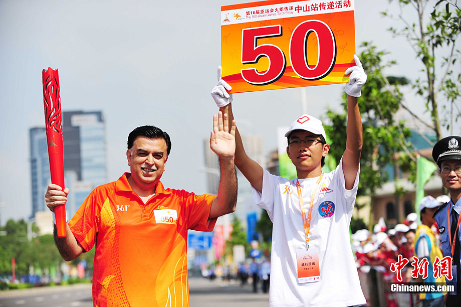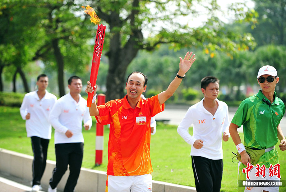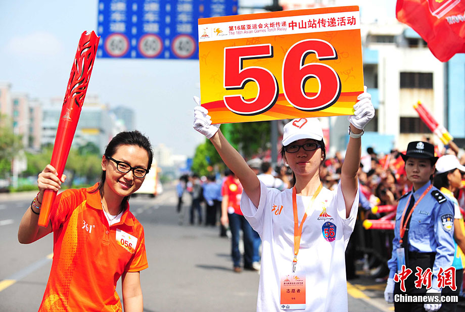 10月13日,備受矚目的第16屆廣州亞運(yùn)會火炬?zhèn)鬟f在廣東省中山市舉行;鹁?zhèn)鬟f從孫文紀(jì)念公園出發(fā),火炬手有科學(xué)家、音樂家、漫畫家、美術(shù)家、企業(yè)家等80名火炬手接力,全長11.2公里。中新社記者 陳文 攝