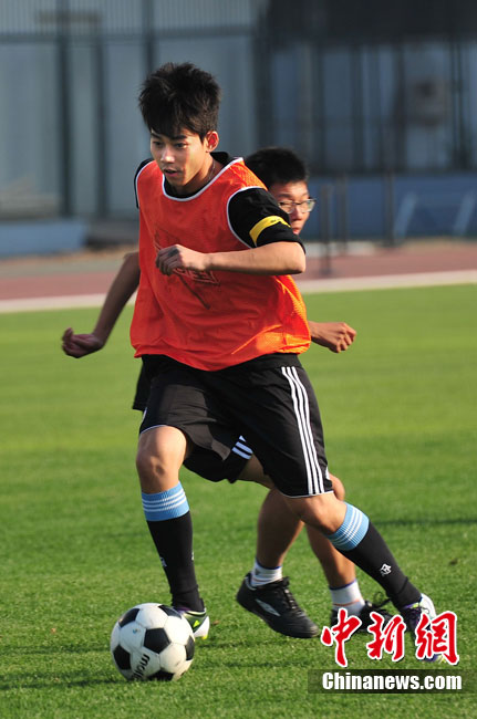 10月13日,“青春綻放”大學(xué)生音樂之旅大賽走進(jìn)北京大學(xué)舉行宣傳活動(dòng)。蘇醒、王嘯坤、王錚亮等潮流歌手組成明星足球隊(duì),與北大學(xué)子們?cè)诰G茵場(chǎng)上切磋球技,揮灑青春熱情。據(jù)悉,“青春綻放”大學(xué)生音樂之旅大型音樂人才選拔活動(dòng)已進(jìn)入高校宣傳階段,將陸續(xù)走進(jìn)清華大學(xué),首都師范大學(xué),中央民族大學(xué)等十多所高校,鼓勵(lì)更多的大學(xué)生參賽,展現(xiàn)青春自我。圖為蘇醒帶球突破。中新社記者 李學(xué)仕 攝