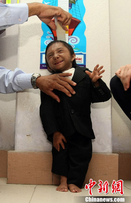 10月14日,在尼泊爾中部小城博克拉,一名尼泊爾醫(yī)生在《吉尼斯世界紀錄大全》工作人員的見證下為18歲的卡根德拉·塔帕·馬加爾測量身高。馬加爾出生于1992年10月14日,現(xiàn)在身高65.53厘米,體重5.45公斤。今天,馬加爾成年,從而打破全球成人最矮身高紀錄。