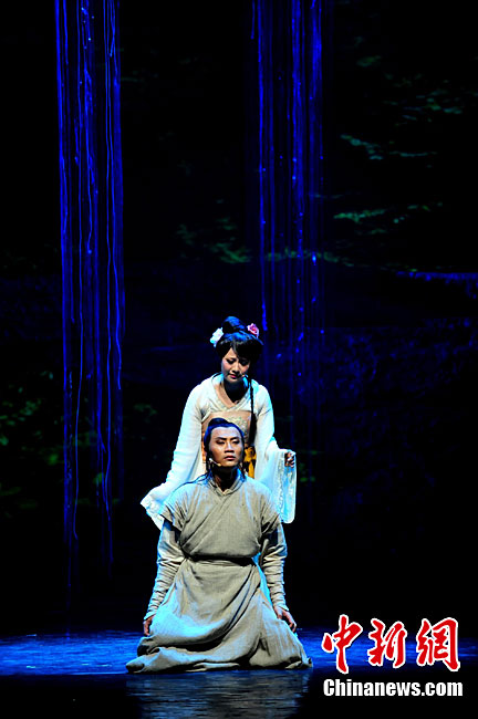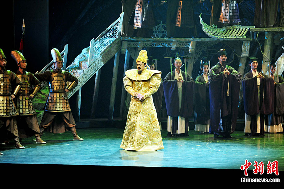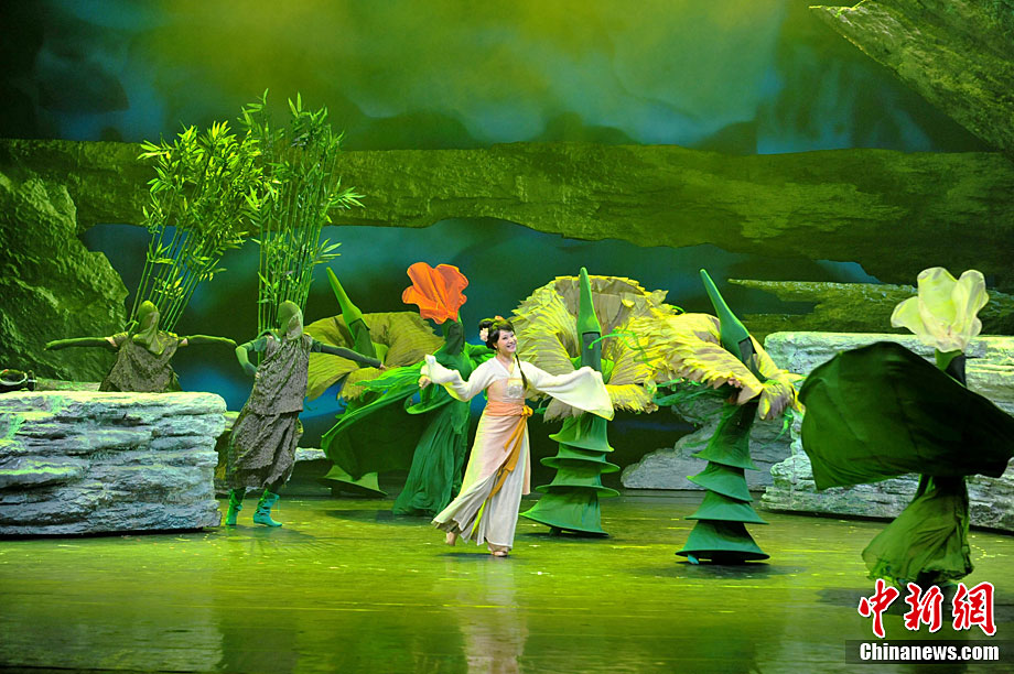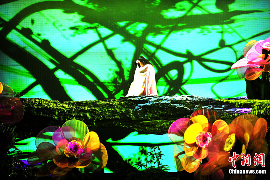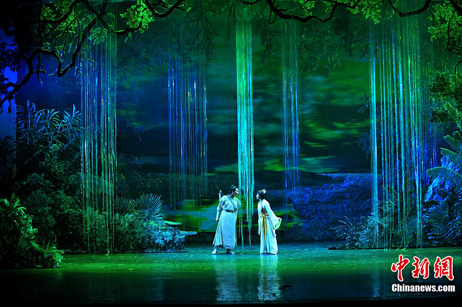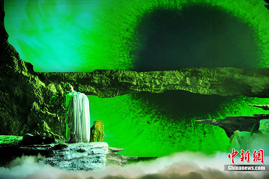 10月16日晚,匯集了中國內(nèi)地頂級音樂劇創(chuàng)作團(tuán)隊(duì)集體智慧的大型原創(chuàng)多媒體音樂劇《青城》在成都錦城藝術(shù)宮舉行全球首演。該劇以青城山傳統(tǒng)道教文化為精神內(nèi)核,以成都市唯一的世界自然文化雙遺產(chǎn)地“青城山—都江堰”作為劇情發(fā)展“舞臺(tái)”,是全球“首部道文化多媒體音樂劇”,也是象征成都市都江堰災(zāi)后文化重建、人性重建、精神重建的文化作品。圖為《青城》劇照。中新社發(fā) 安源 攝