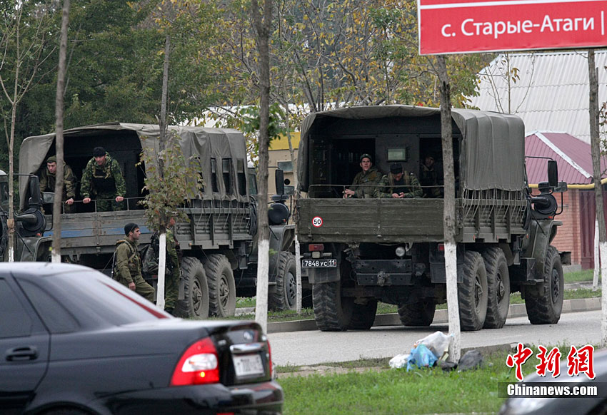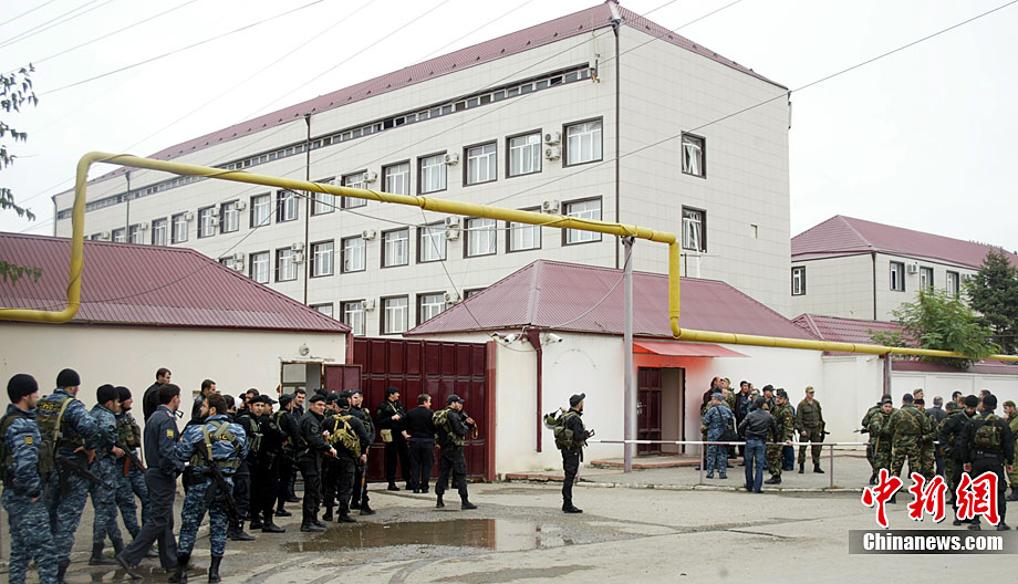 當(dāng)?shù)貢r間10月19日,俄羅斯車臣共和國首府格羅茲尼市列寧區(qū)的車臣議會大樓遭到武裝分子襲擊,造成2人死亡。圖為安全部隊在消滅完襲擊份子后,準(zhǔn)備撤離議會大樓。