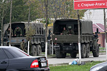 當?shù)貢r間10月19日,俄羅斯車臣共和國首府格羅茲尼市列寧區(qū)的車臣議會大樓遭到武裝分子襲擊,造成2人死亡。圖為當?shù)匕踩筷犜谧h會大樓周邊進行安全警戒。