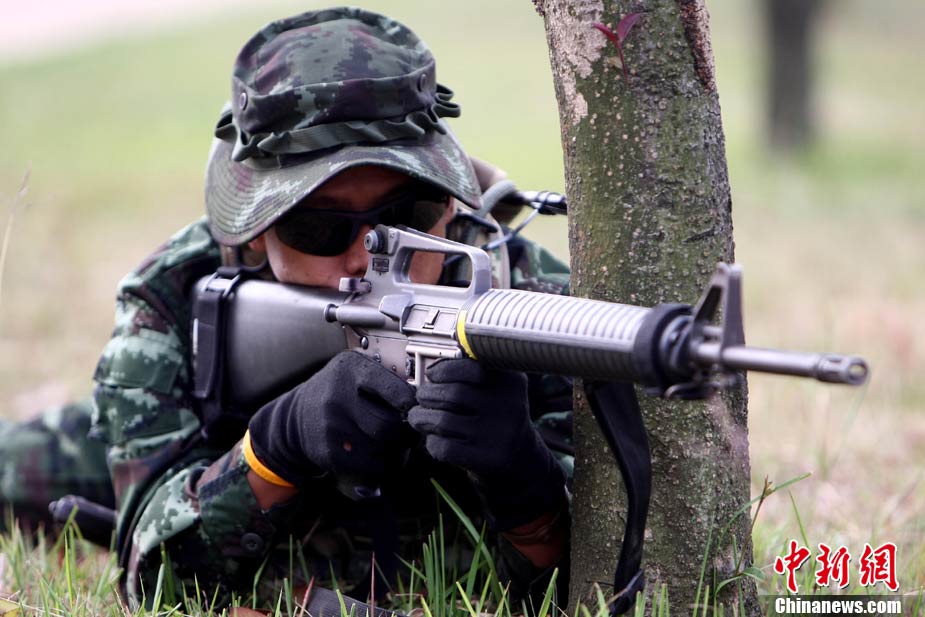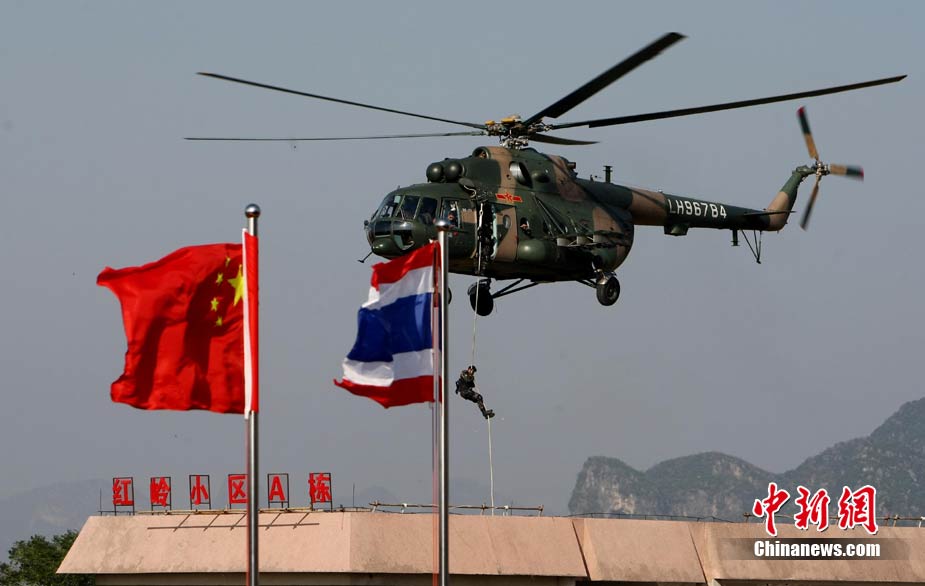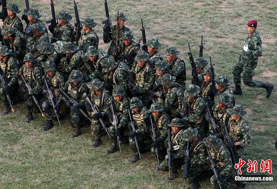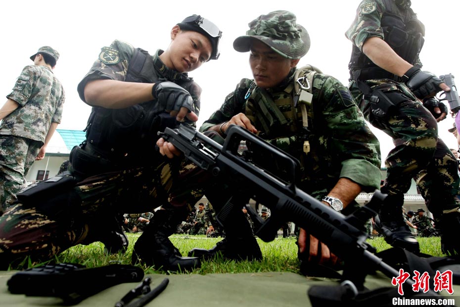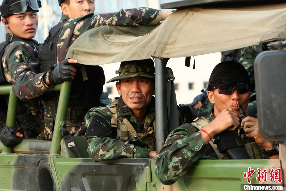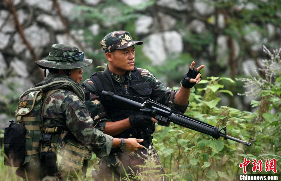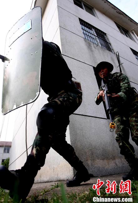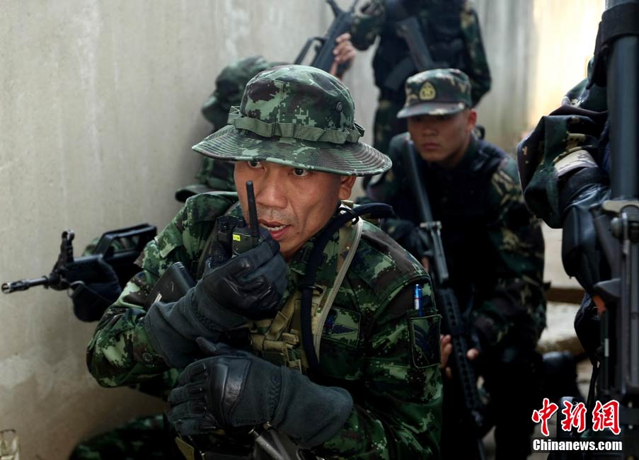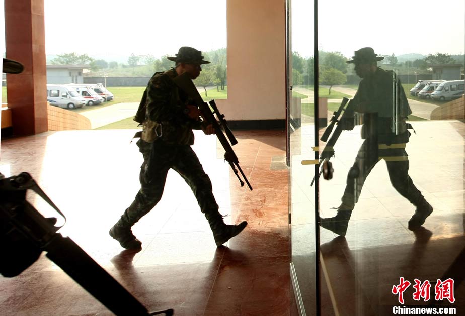 10月19日,“突擊-2010”中泰反恐聯(lián)訓(xùn)在廣州軍區(qū)“紅嶺”合同戰(zhàn)術(shù)訓(xùn)練基地舉行“獵鼬”行動實兵綜合演練,圍繞“城市聯(lián)合反恐行動”這一課題,演練了快速封鎖、偵搜排查、隔離疏散、立體突擊4個行動。演練模擬一名為“臭鼬”的國際恐怖組織在泰國制造暴力恐怖活動后,秘密潛入中國G市紅嶺小區(qū),企圖在XX地區(qū)領(lǐng)導(dǎo)人峰會期間繼續(xù)制造恐怖事件,干擾峰會順利進行。中泰兩國政府依據(jù)聯(lián)合反恐協(xié)議,決定成立聯(lián)合指揮機構(gòu),抽調(diào)特種部隊精銳力量組成“獵鼬突擊隊”,共同進行反恐作戰(zhàn)任務(wù)。 中新社記者 杜洋 攝