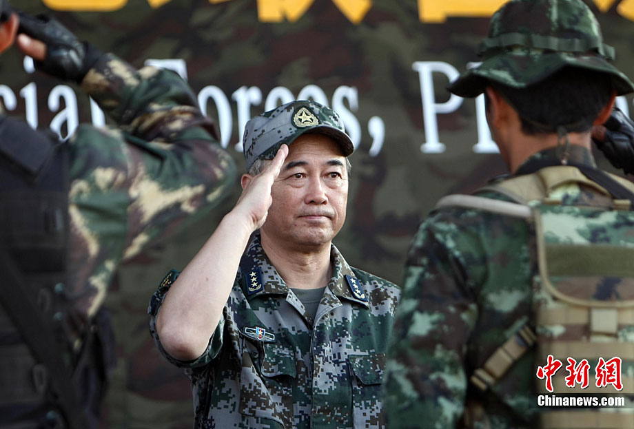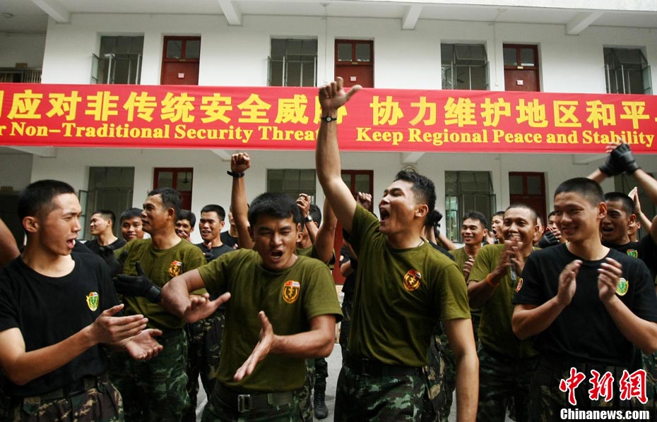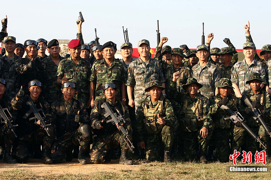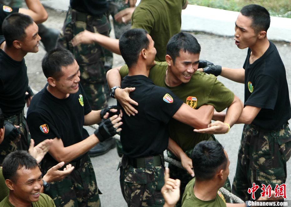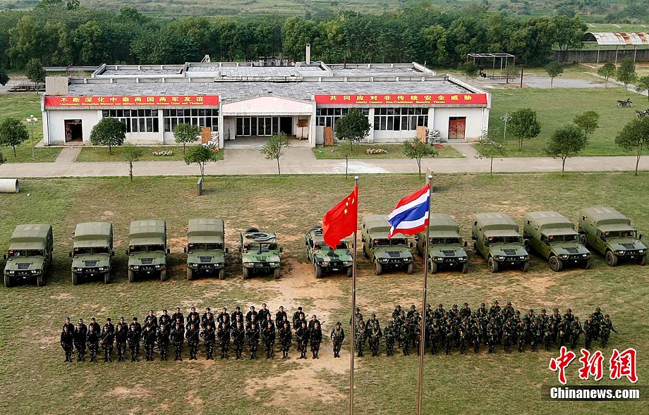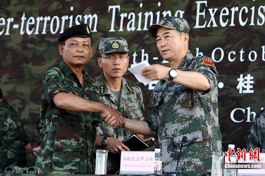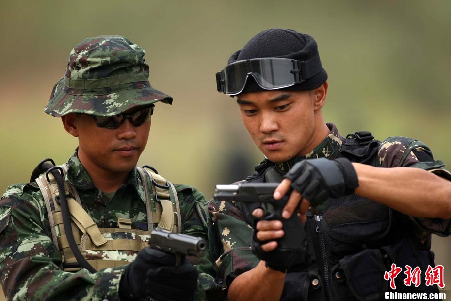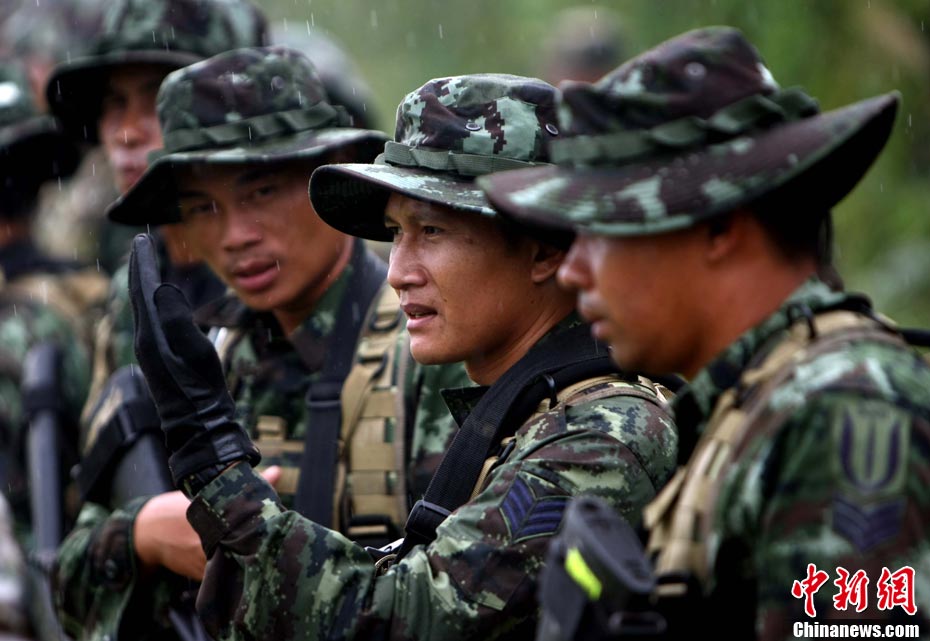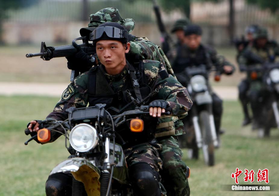 10月19日,“突擊-2010”中泰反恐聯(lián)訓(xùn)在廣州軍區(qū)“紅嶺”合同戰(zhàn)術(shù)訓(xùn)練基地舉行“獵鼬”行動實兵綜合演練,圍繞“城市聯(lián)合反恐行動”這一課題,演練了快速封鎖、偵搜排查、隔離疏散、立體突擊4個行動。演練模擬一名為“臭鼬”的國際恐怖組織在泰國制造暴力恐怖活動后,秘密潛入中國G市紅嶺小區(qū),企圖在XX地區(qū)領(lǐng)導(dǎo)人峰會期間繼續(xù)制造恐怖事件,干擾峰會順利進行。中泰兩國政府依據(jù)聯(lián)合反恐協(xié)議,決定成立聯(lián)合指揮機構(gòu),抽調(diào)特種部隊精銳力量組成“獵鼬突擊隊”,共同進行反恐作戰(zhàn)任務(wù)。 中新社記者 杜洋 攝