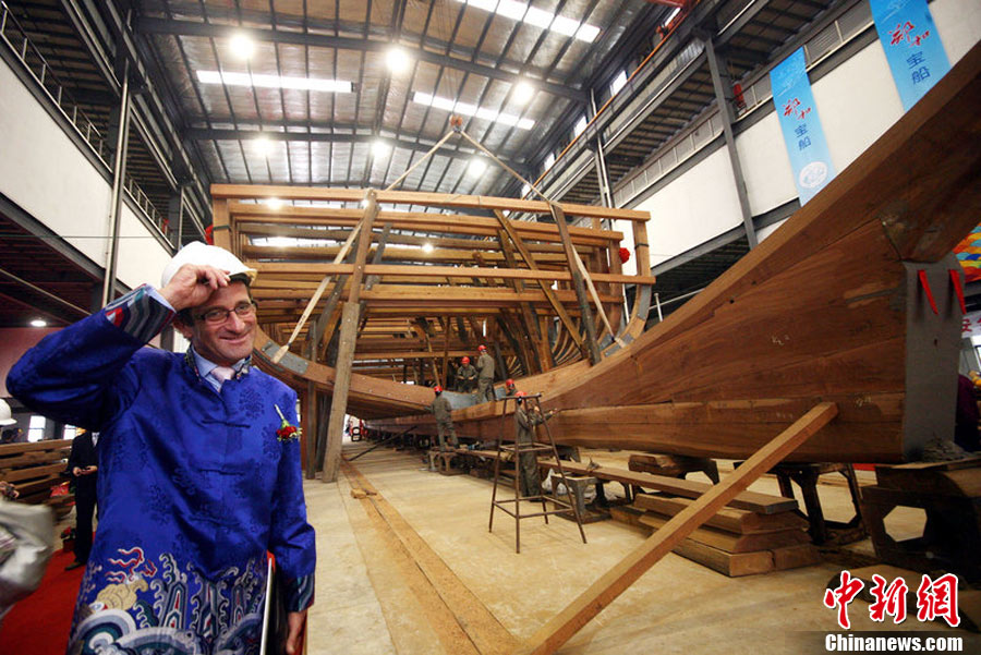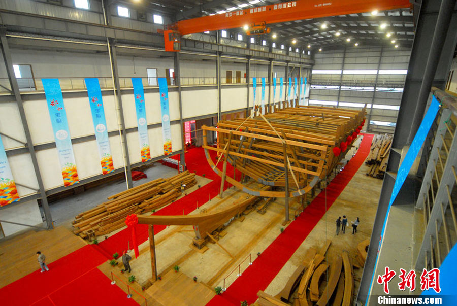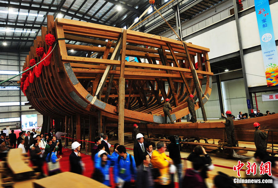 10月20日,南京,作為“2010年南京名城會”的序曲,“鄭和寶船復建慶典”在鄭和寶船廠舉行,主體已經(jīng)完工1/3的“鄭和寶船”露出“廬山真面目”。這座鄭和寶船將在明年9月船體竣工,2013年將沿著鄭和當年的航海路線“環(huán)球航行”。圖為復建的寶船進行了肋骨安放儀式。邵丹 攝 圖片來源:CFP視覺中國