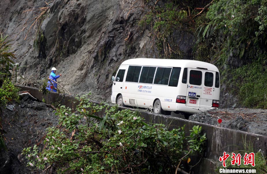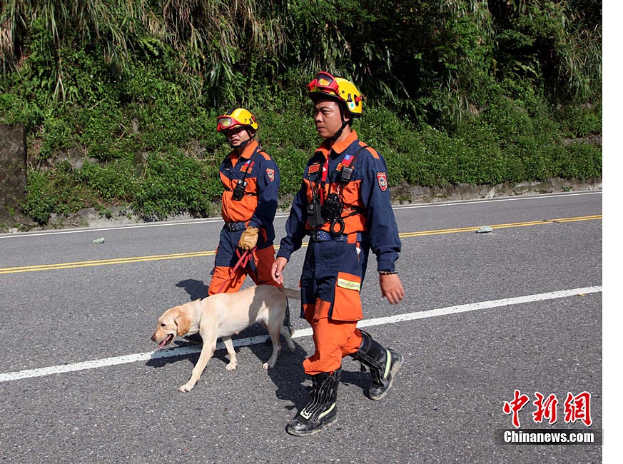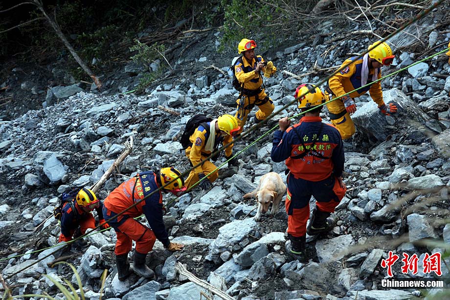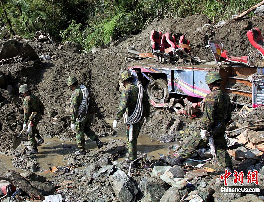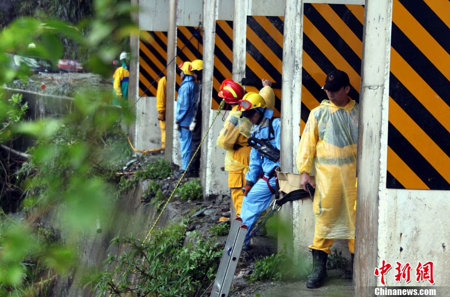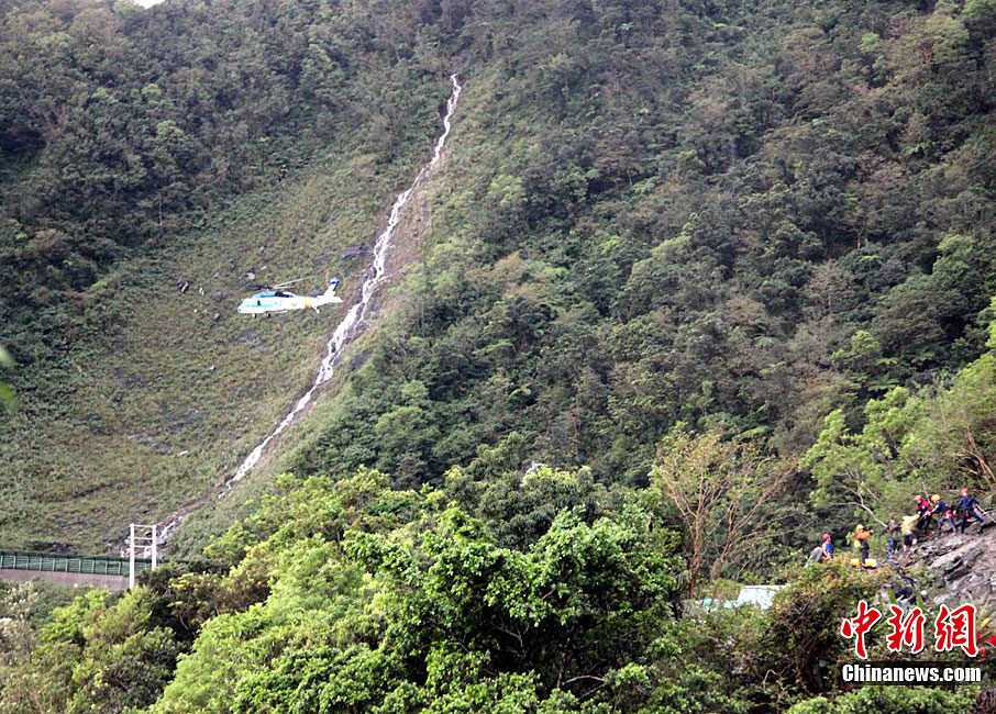 臺灣蘇花公路塌方事故已逾5天,事故發(fā)生的宜蘭縣一帶26日持續(xù)大雨。然而對失蹤者(包括18名大陸游客和2名大陸領(lǐng)隊(duì))的海陸空三路搜索仍在持續(xù),F(xiàn)場搜索進(jìn)展艱難,其間并發(fā)生一名搜救隊(duì)員被砸傷的情況。 中新社記者 王健 攝