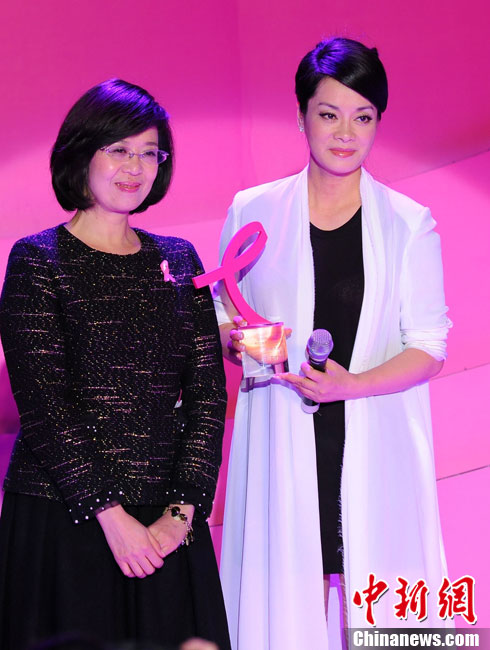 10月26日晚,《時尚健康》粉紅絲帶盛典在北京盛大舉行。歷屆粉紅絲帶代言人代表毛阿敏、柯藍與今年的代言人海清、張雨綺共同登上粉紅舞臺,江映蓉、愛戴、葉蓓、翁虹、范志博、鞏新亮、孟倩、李鑫雨等眾星云集。目前,“粉紅絲帶乳腺癌防治運動” 已成為中國最具影響力的時尚公益活動之一。圖為張雨綺、海青與眾嘉賓合影。中新社發(fā) 李學仕 攝