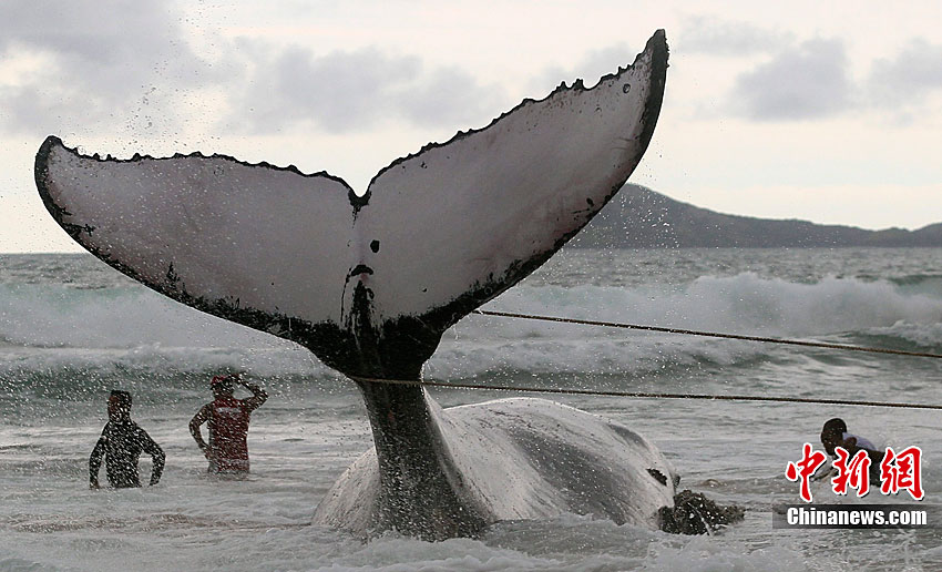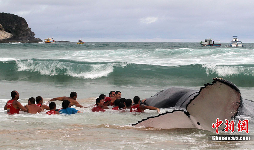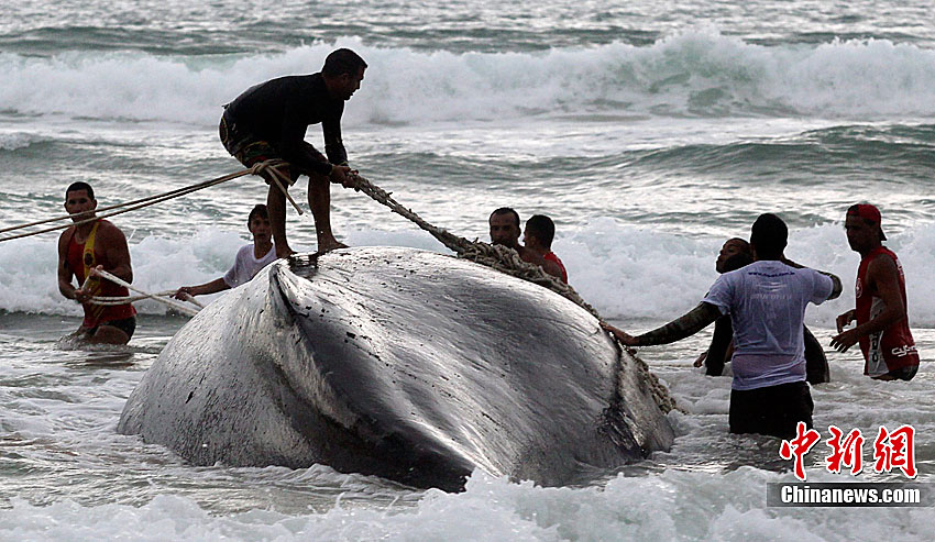 當(dāng)?shù)貢r(shí)間10月26日,在距離巴西里約熱內(nèi)盧192公里的布濟(jì)烏斯,救援人員試圖挪動(dòng)擱淺的座頭鯨。座頭鯨每年7月到11月從南極洲向北遷往巴西海域交配。