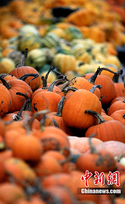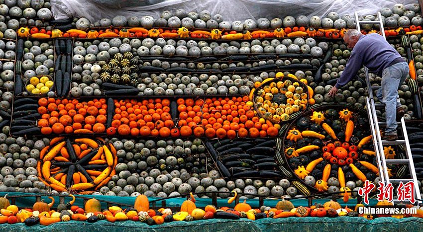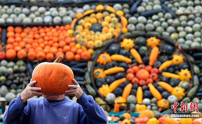 萬圣節(jié)到來的前夕,英國斯林登老農托尼·史密斯將自己種植數(shù)百只南瓜堆成牽引機車的模型。