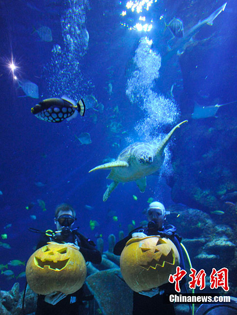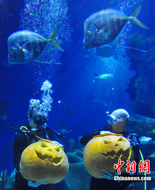 當(dāng)?shù)貢r(shí)間10月27日,英國倫敦,潛水員在水下雕刻南瓜鬼臉,宣傳本周末倫敦水族館的萬圣節(jié)特別活動(dòng)。