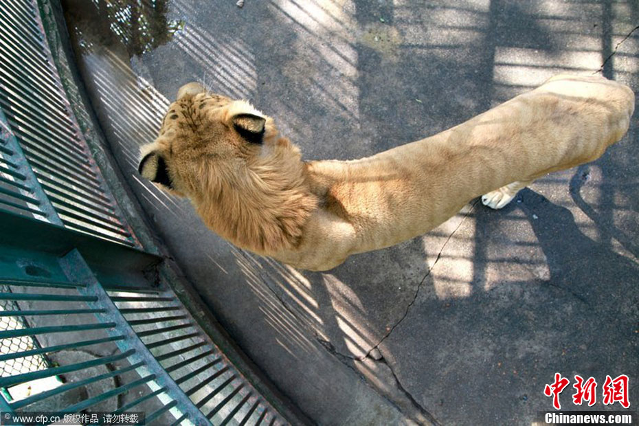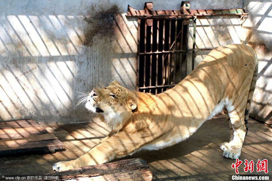 2010年10月27日,江西九江甘棠公園動物園工作人員正隔著鐵欄桿在給一只虎頭獅身的“怪物”撓癢。這只“怪物”名叫獅虎獸,是是雄性獅子和雌性老虎交配產(chǎn)生的后代。此只獅虎獸引進(jìn)自安徽安慶,目前已三歲,這是獅虎獸首次亮相江西,有關(guān)資料顯示,獅虎獸的成活率只有50萬分之一,目前世界上存活的獅虎獸只有20只左右,所以被形容為比熊貓還珍貴的動物。 圖片來源:CFP視覺中國