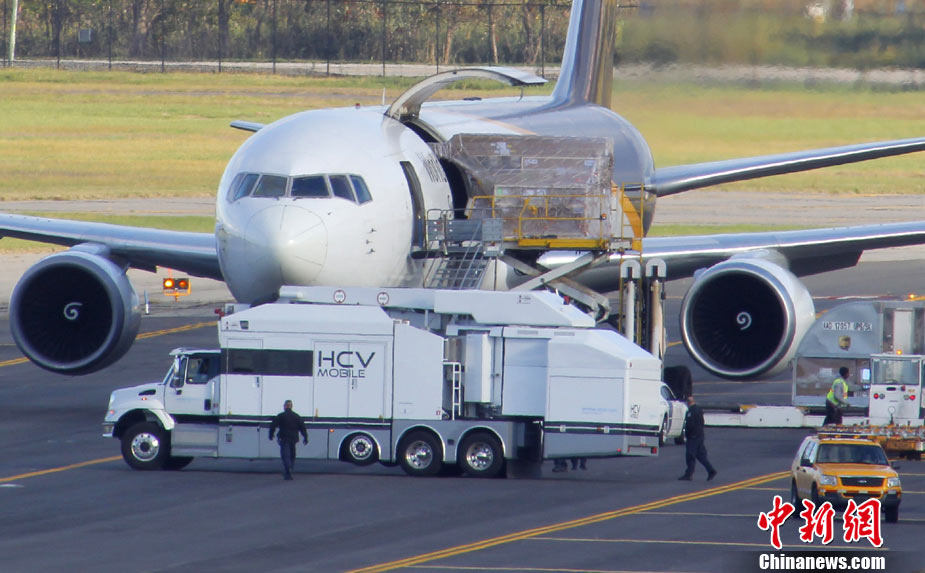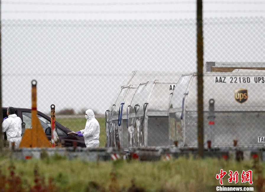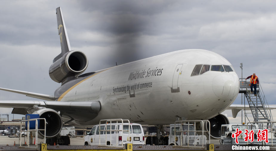 10月29日,一架從也門飛往美國的UPS貨機在倫敦機場接受檢查時,發(fā)現(xiàn)疑似爆炸物,隨后奧巴馬命令相關部門進行徹查,以確定此事背后是否還有更大恐怖襲擊陰謀。 圖為美國新澤西紐瓦克機場,一架美國聯(lián)合包裹快遞(UPS)公司貨機停在停機坪上。