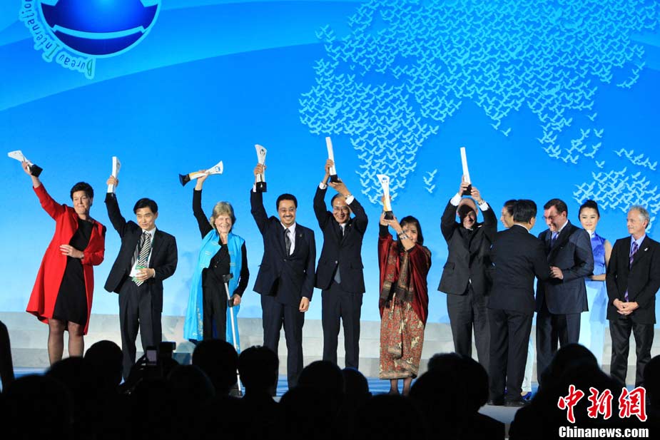 10月30日晚,上海世博會(huì)舉行頒獎(jiǎng)晚會(huì),頒發(fā)“世博會(huì)獎(jiǎng)”、“COSMOS”獎(jiǎng)、“國展局獎(jiǎng)?wù)隆薄!笆啦⿻?huì)獎(jiǎng)”分為ABCD四類展館和金銀銅等次以及展館設(shè)計(jì)獎(jiǎng)、創(chuàng)意展示獎(jiǎng)、主題演繹獎(jiǎng)。圖為英國、韓國、西班牙分別獲得A類展館設(shè)計(jì)獎(jiǎng)金銀銅;沙特、日本、馬來西亞分別獲得創(chuàng)意展示獎(jiǎng)金銀銅;德國、俄羅斯、法國分別獲得主題演繹獎(jiǎng)金銀銅。 中新社記者 潘索菲 攝